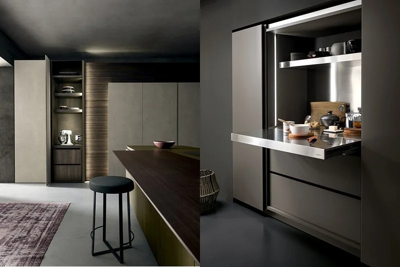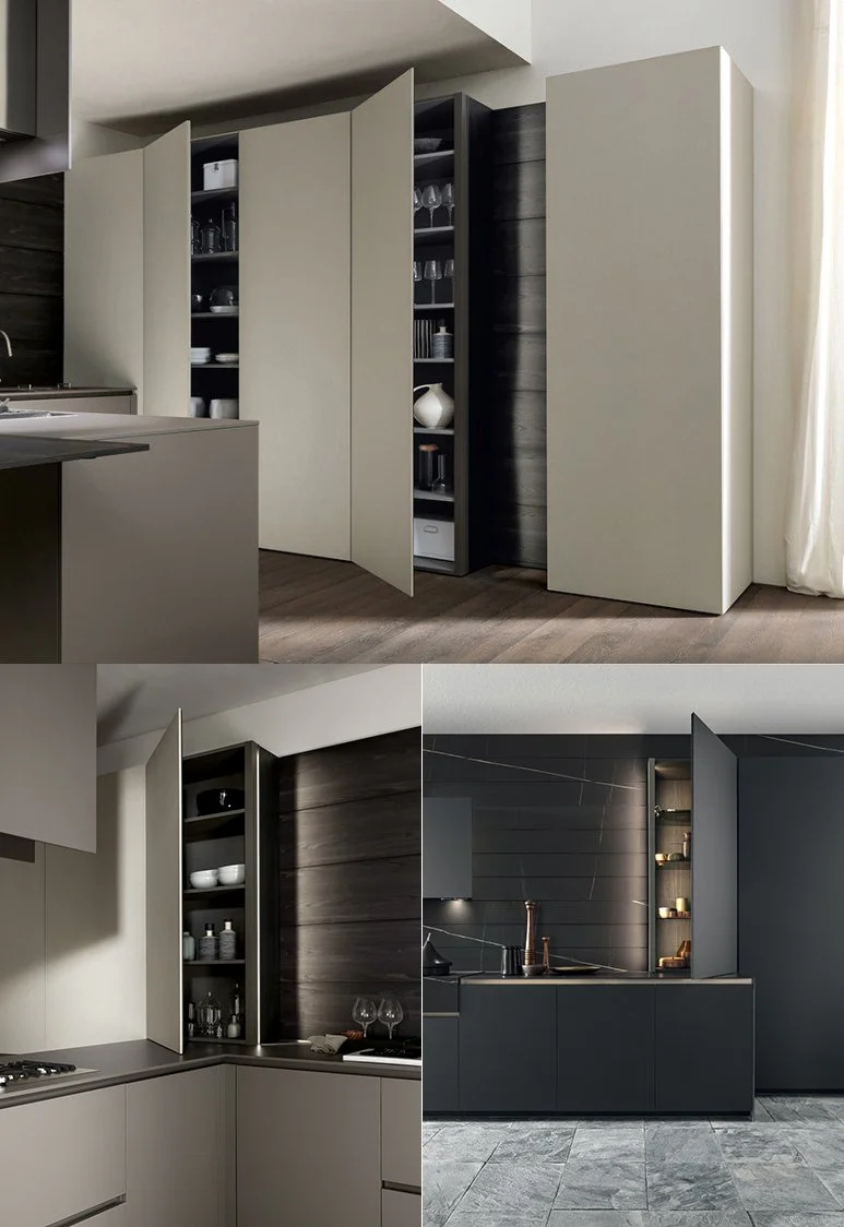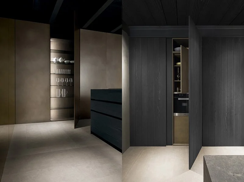 이 외에도 포켓장을 가로로 긴 형태로 구성할 시, 세컨드 쿡탑이나 싱크를 접목하여 보조 주방으로 사용할 수 있습니다. 평소에는 도어를 닫아 깔끔한 주방을 유지합니다.