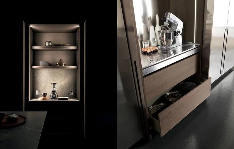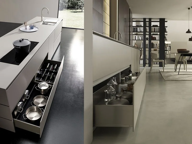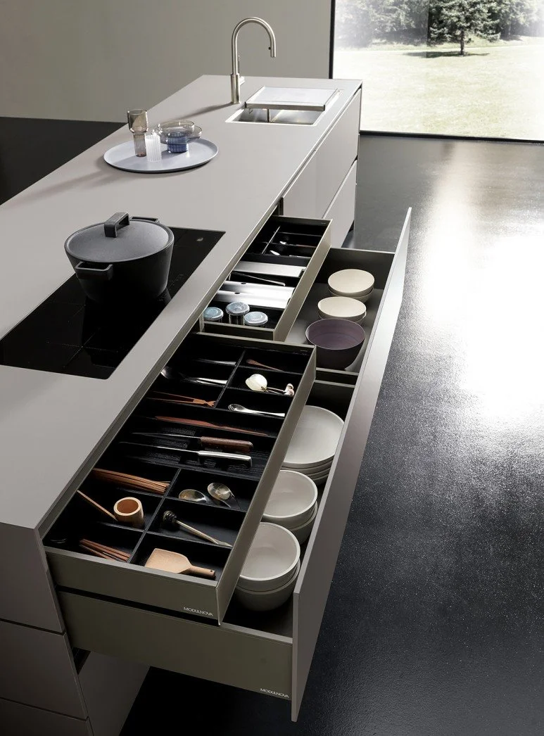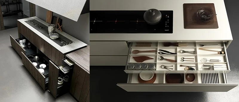 각 수납은 세밀하게 분할 설계되어 커트러리, 테이블웨어, 크고 작은 조리 도구까지 기능과 용도에 맞게 정리가 가능합니다.