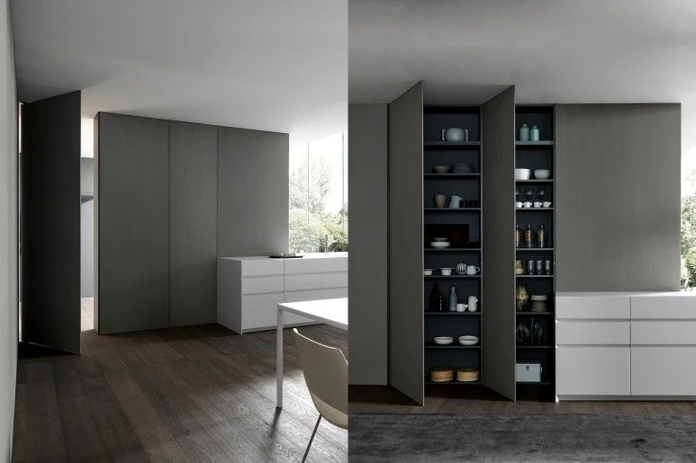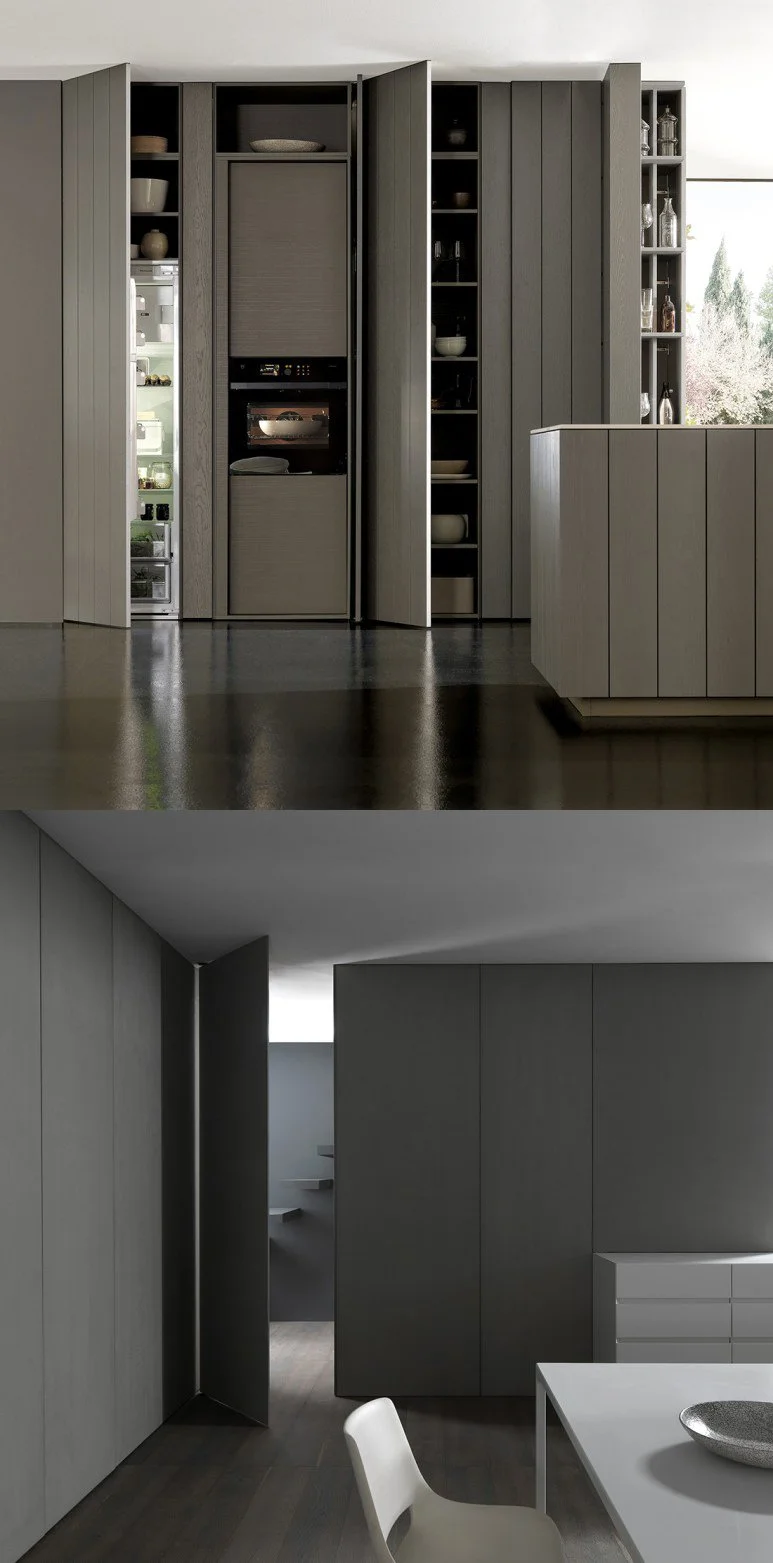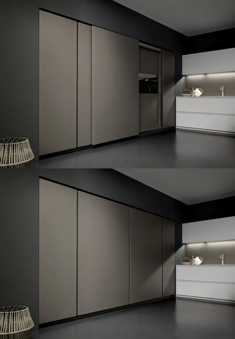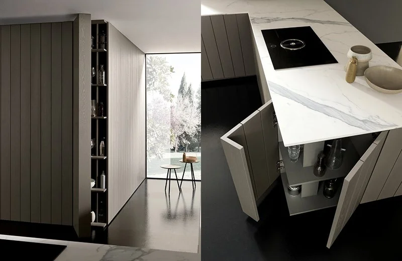 수납장과 슬라이딩 레일을 결합시킨 슬라이딩 월 시스템은 양념이나 와인잔, 타월 랙에 이르기까지 다양한 물품을 벽 안으로 깔끔하게 숨겨 정리할 수 있습니다.