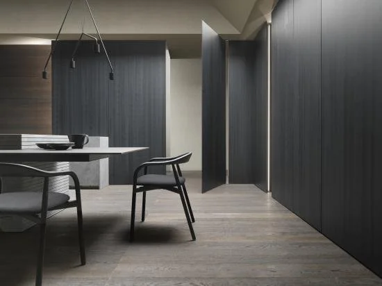 우드 슬랫을 통한 히든장 또는 벽체와 도어를 동일선상에 시공해 군더더기 없는 뷰와 확장감을 전하는 히든 도어를 계획할 수 있습니다. 모듈노바는 내부 무게를 혁신적으로 줄이는 허니콤 기술을 도어에 적용해 슬림하고 가벼운 도어를 선보입니다.