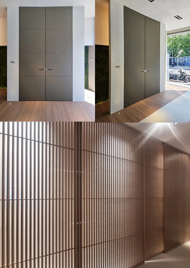 별도의 문틀 없이 간편한 설치를 도모하고, 벽면과의 완전한 통합과 입면의 매끄러운 연속성을 실현합니다. 도어 높이를 천정까지 올릴 수 있는 풀 하이트(full-height) 솔루션을 탑재합니다.