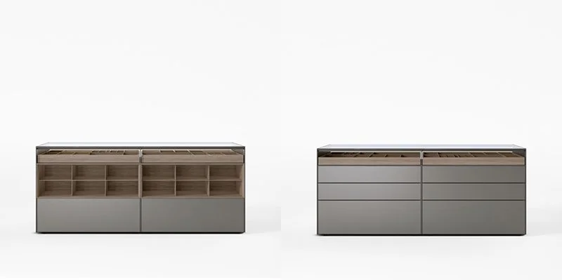 첫 번째로 소개하는 신제품은 새로운 드레스룸 아일랜드 알테어입니다. 기존에 출시되었던 돌먼(Dolmen)의 업그레이드 버전으로서 상부 슬라이딩 액세서리 트레이가 포인트가 되는 제품입니다.
