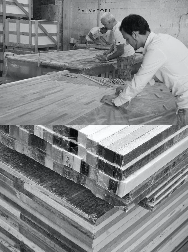 살바토리는 이러한 문제를 해결하고자 원산지가 보증된 전 세계 채석장에서 버려진 잔여 석재와 작은 돌조각을 수집하였습니다. 이러한 폐석재를 진공 처리 후, 콩 레진 천연 접착제를 사용해 Lithoverde®로 재탄생시켰습니다.