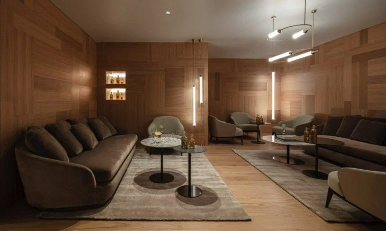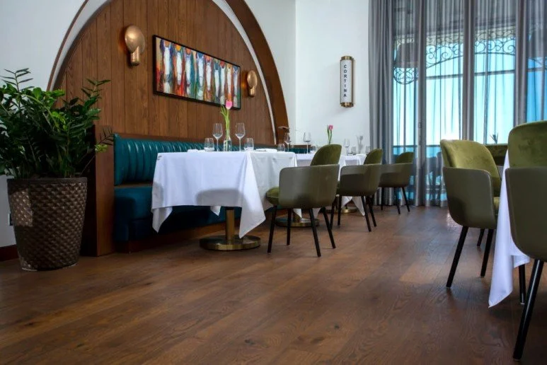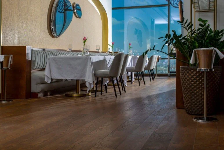 바 라운지에는 조르다노의 광폭 마루 콰트로첸토 이탈리아노를 시공하였습니다. 비앙코스피노 컬러로 밝고 화사한 분위기를 조성합니다.