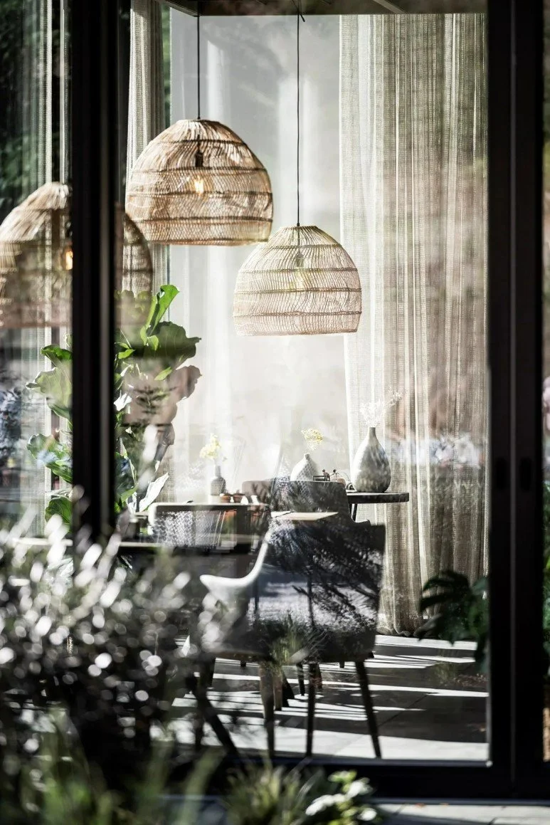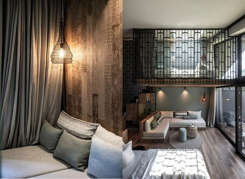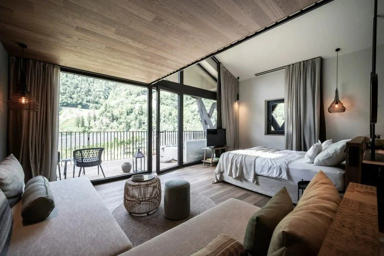 한편 헛간을 완전히 재구성한 객실은 우드와 라탄, 패턴 활용을 통해 이국적이면서도 편안한 감성을 불러 일으킵니다. 통창과 기둥, 높은 천정고로 확장감을 전하며, 외부 자연을 내부로 완전히 끌어 들입니다.