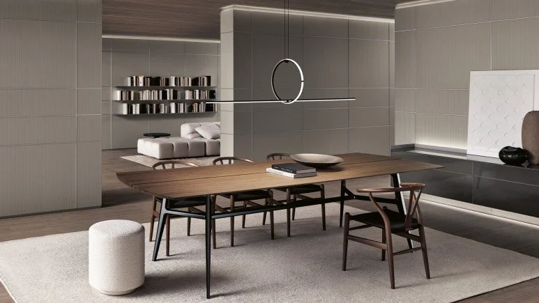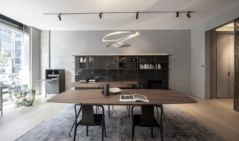 하농 쇼룸에서는 중심에서부터 바깥으로 퍼지는 우드 패턴이 고급스러운 노체 월넛 상판의 만타 테이블을 직접 만나보실 수 있습니다.