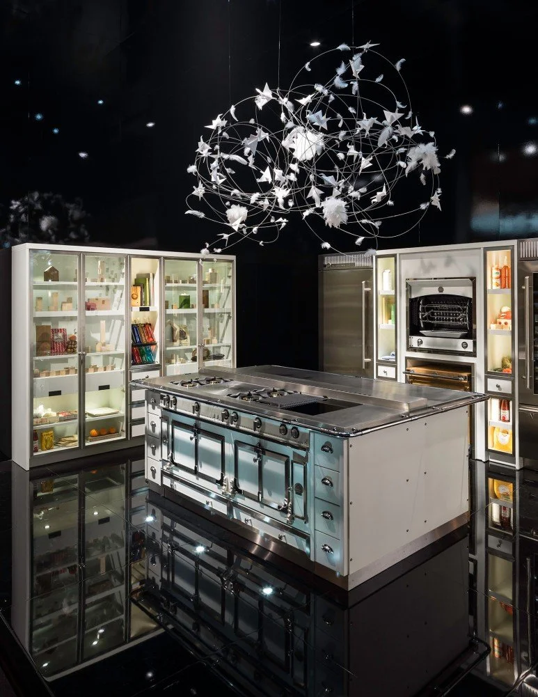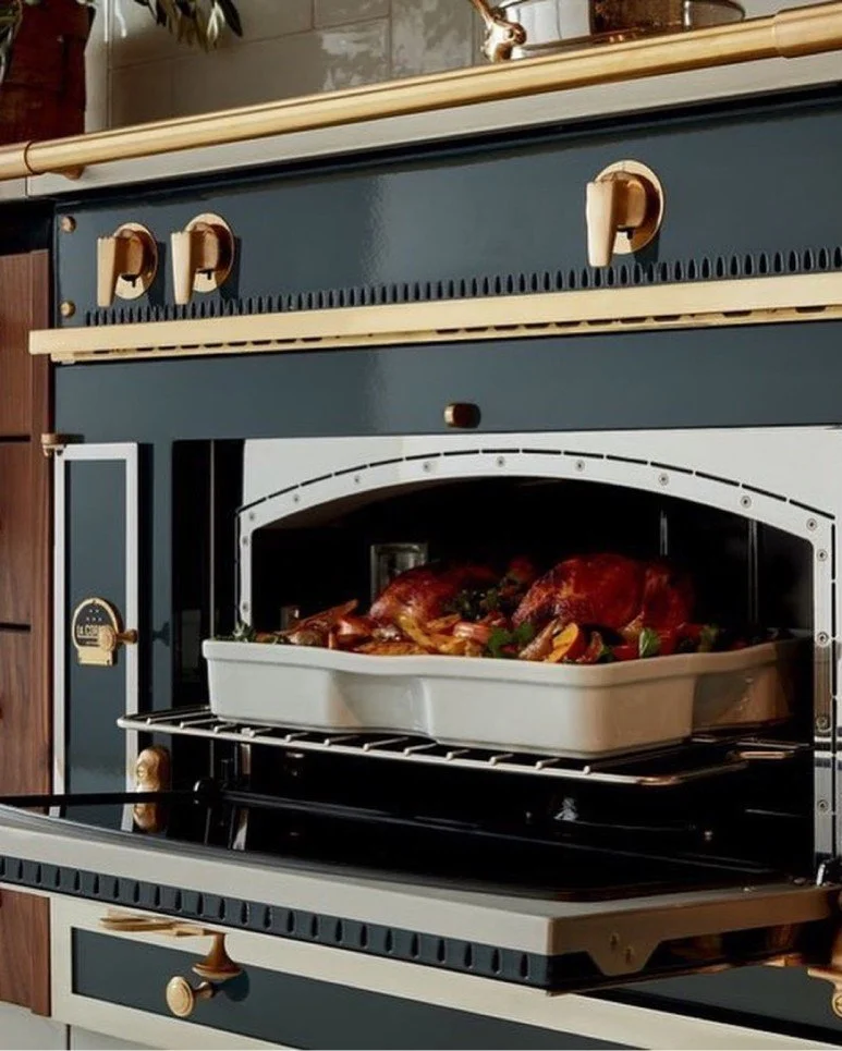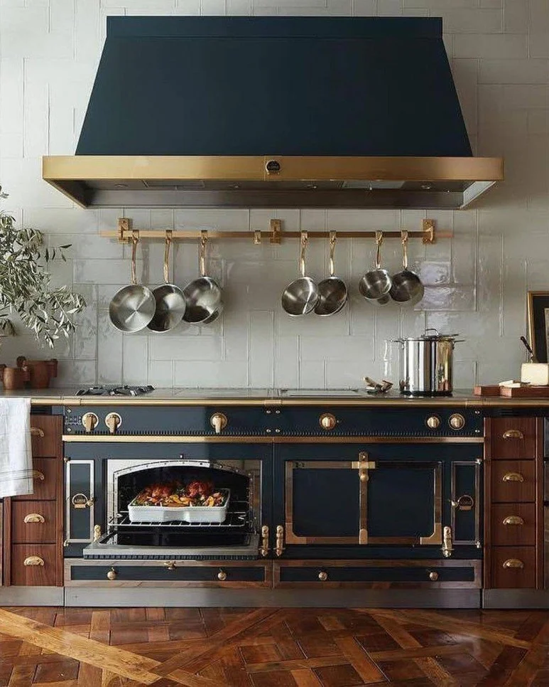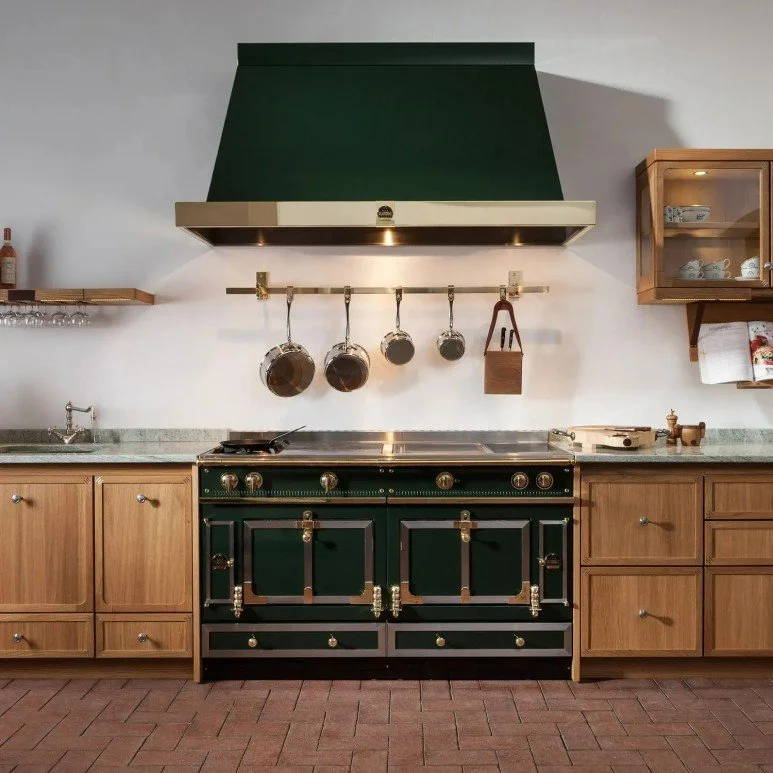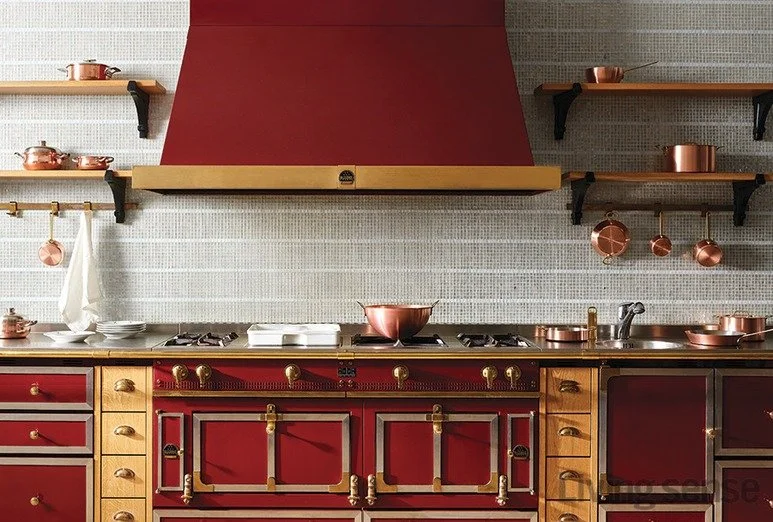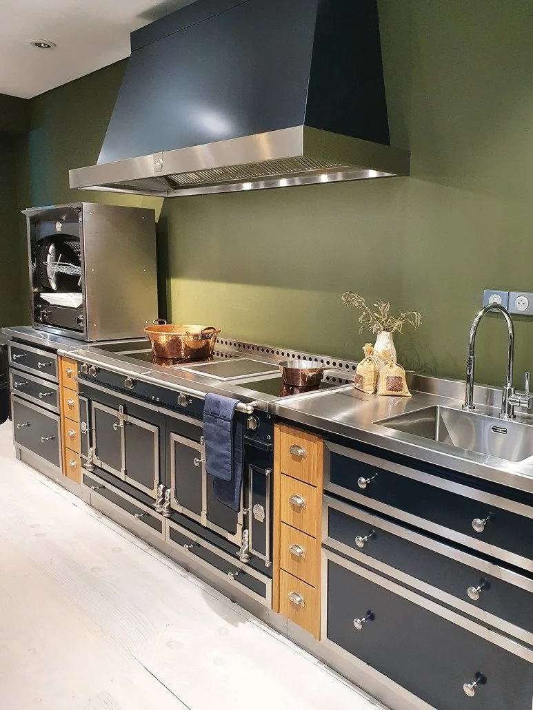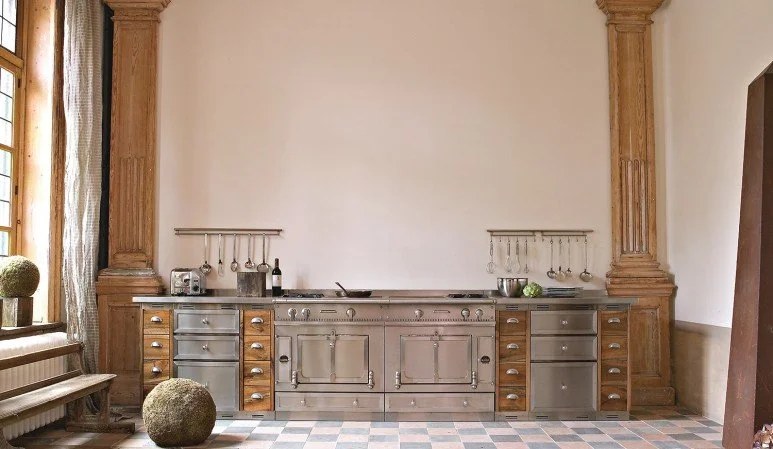 볼티드 오븐과 육중한 도어, 솔리드 스테인리스 스틸 상판, 블랙 에나멜 접시, 황동 버너의 조합은 화려한 궁전과 같이 주방 분위기를 압도 시킵니다.