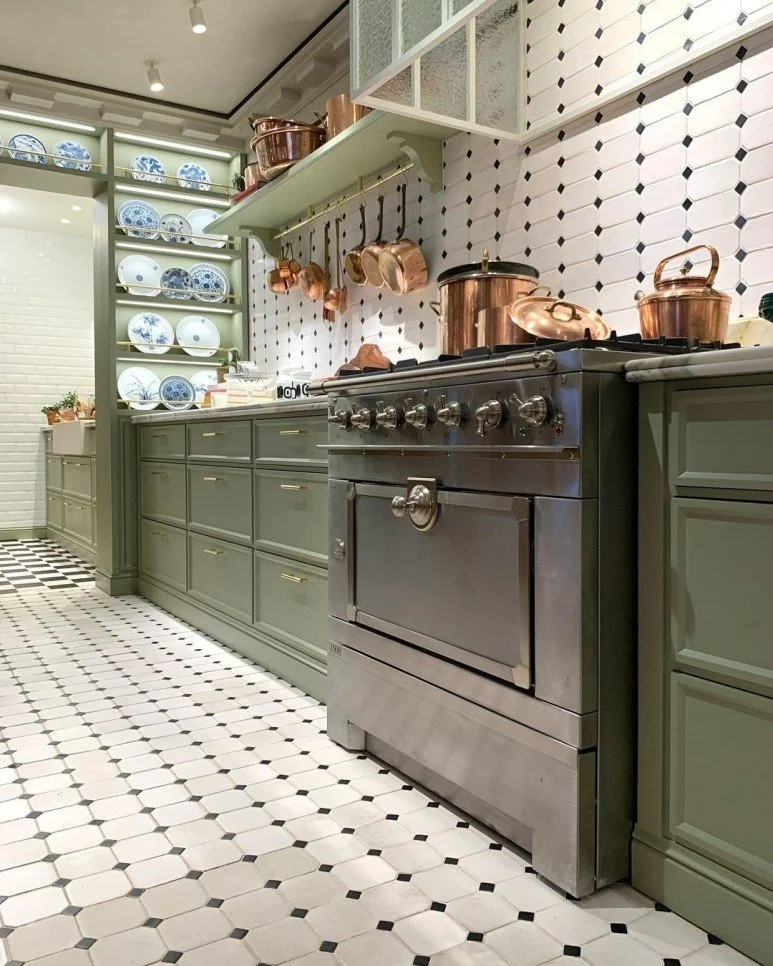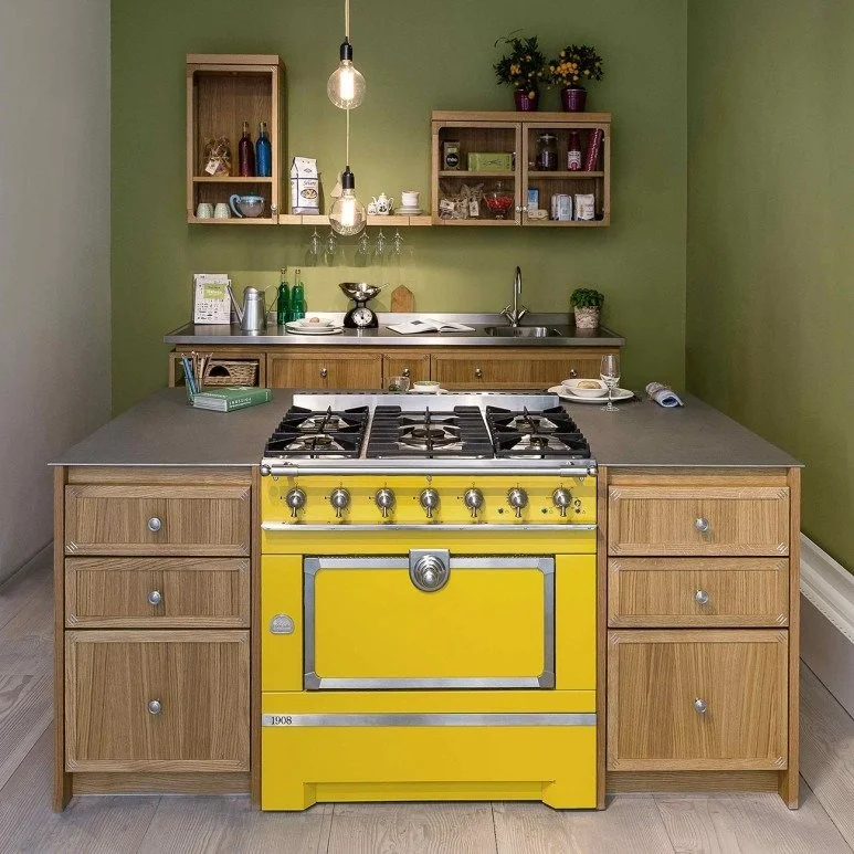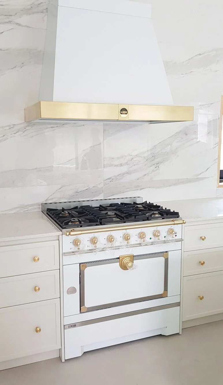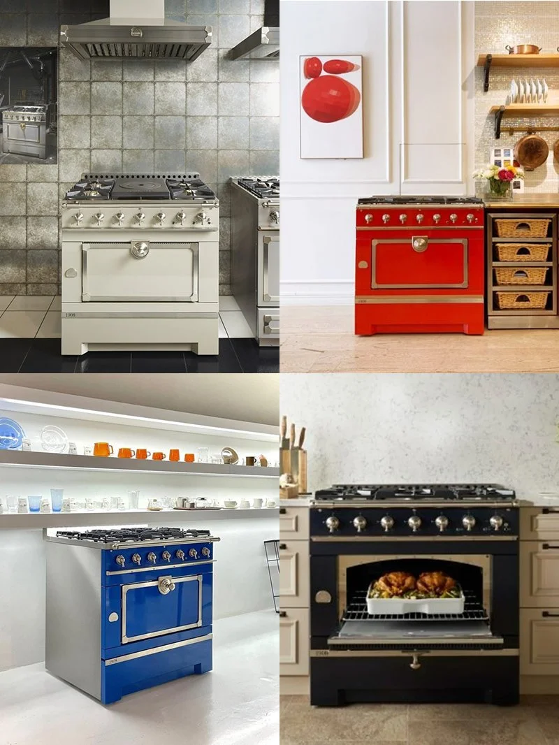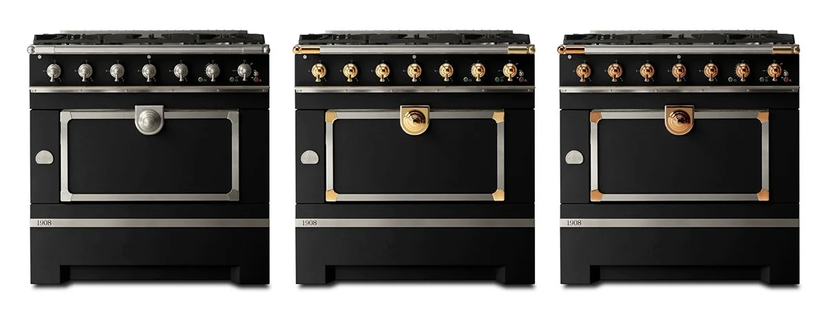 볼티드 오븐과 육중한 도어, 솔리드 스테인리스 스틸 상판, 블랙 에나멜 접시, 황동 버너의 조합은 화려한 궁전과 같이 주방 분위기를 압도 시킵니다.