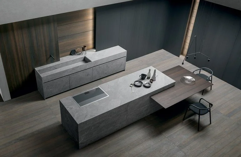 고급 천연석으로 마감해 주방에 안정적인 무게감을 선사하는 블레이드 랩, 아일랜드에 테이블 상판을 접목시킨 이색적인 구조로, 다리 없이 공중에 떠있는 듯한 상판이 시선을 사로잡는 모델입니다.