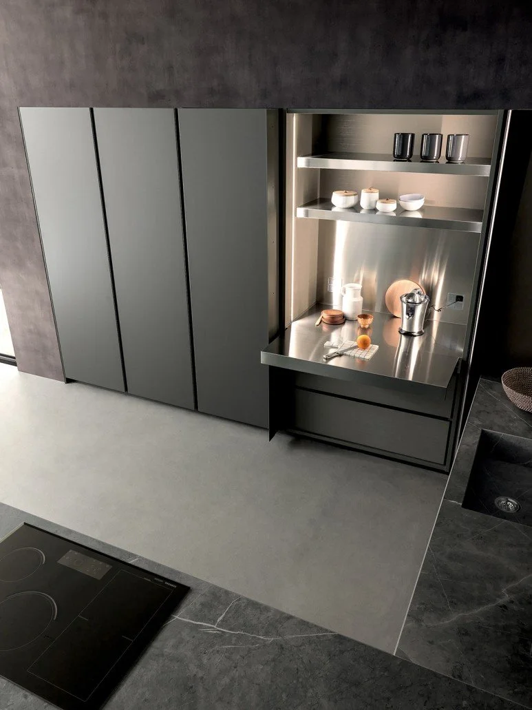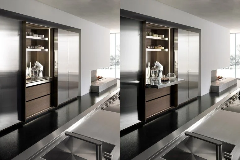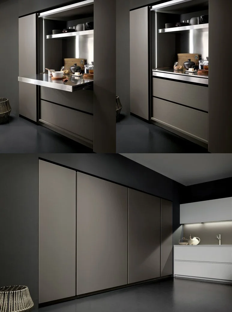 사용자의 동선에 맞게 수납 모듈을 이동시키고, 사용하지 않을 때는 벽 안쪽으로 모듈을 수납해 깔끔한 주방을 유지해줍니다.