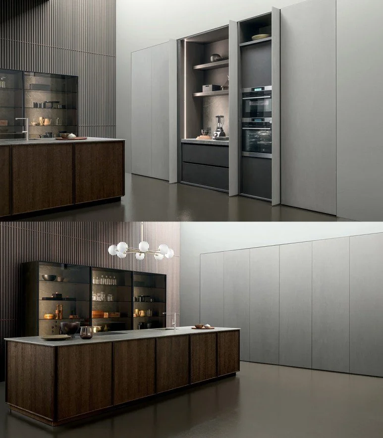 한편 수납 모듈을 아일랜드 전면에도 적용할 수 있는데요. 월 시스템과 동일한 구성이지만, 효율성과 디자인적인 측면이 더욱 극대화된 것을 확인할 수 있습니다.