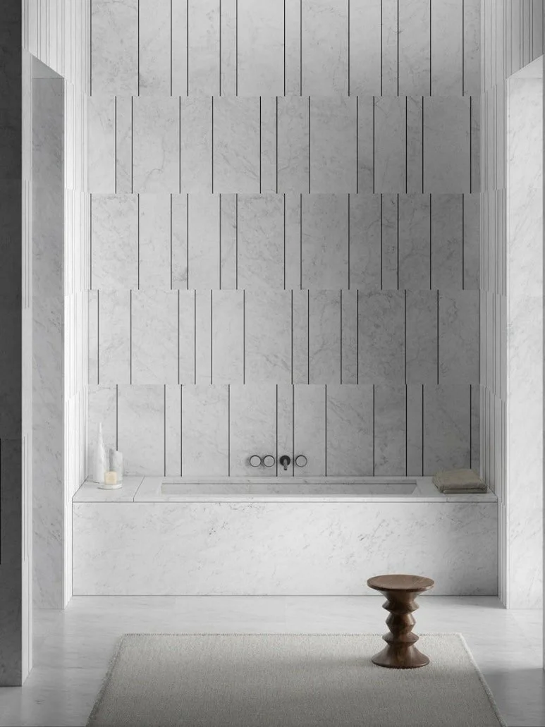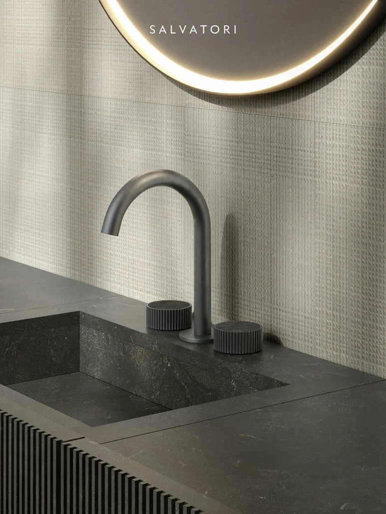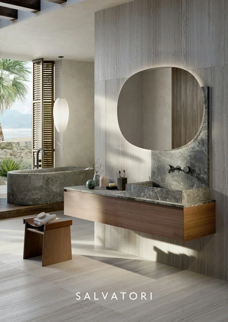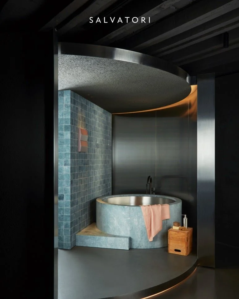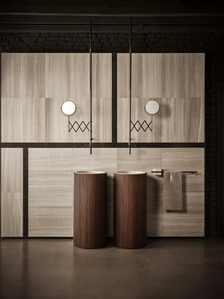 다른 공간 대비 한정적인 디자인으로 조성되는 욕실에 이색적인 소재 병치로 새로운 분위기를 연출할 수 있습니다. 2024 밀라노 디자인 위크와 살로네 델 모빌레에서도 소재 병치를 통한 트렌디한 디자인을 유독 많이 볼 수 있었습니다.