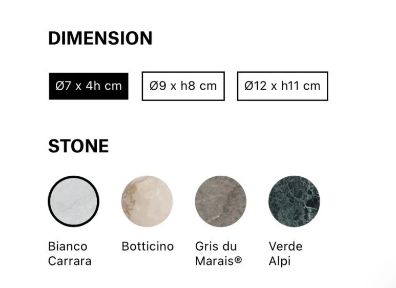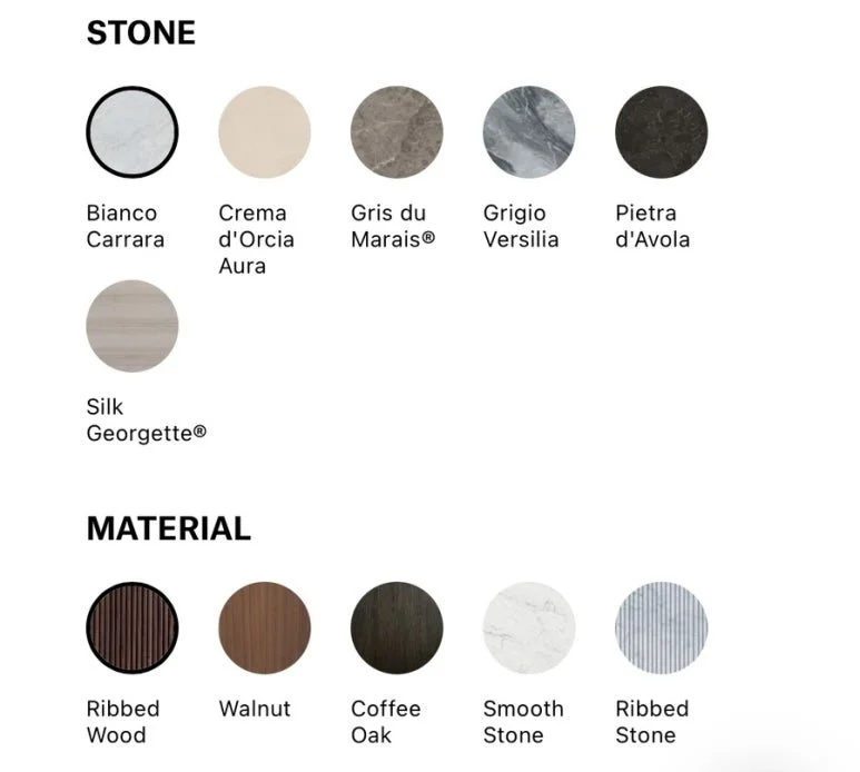 비앙코 카라라 코톤(Bianco Carrara Cotone), 그리스 뒤 마라이즈(Gris du Marais), 피에트라 다볼라 코톤(Pietra d’Avola Cotone), Pietra d’Avola(피에트라 다볼라) 4가지 석재로 제안됩니다.