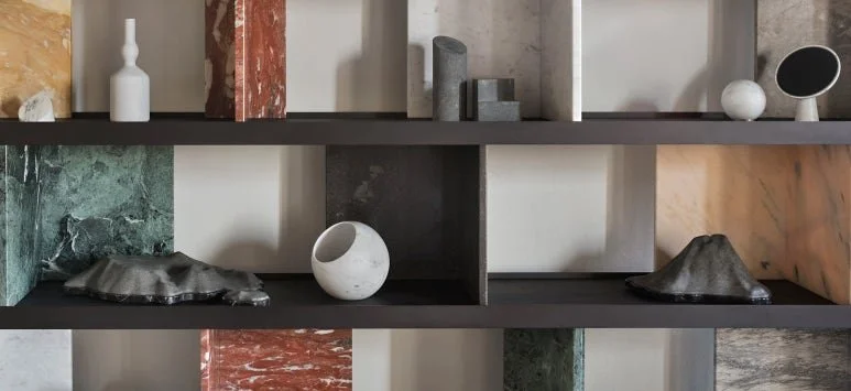 가장 다크한 컬러인 피에트라 다볼라에는 골드 컬러 인서트가, 나머지 석재에는 미드나잇 블랙 페인트 인서트가 적용되어 실내에 남다른 깊이감을 만들어 냅니다.