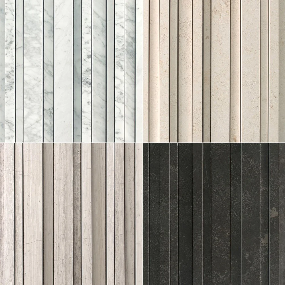 293 X 586 X 10mm, 70 X 586 X 10mm 총 2가지 사이즈로 구비되며, 비앙코 카라라(Bianco Carrara), 크레마 도르시아 셀렉트(Crema d’Orcia Select), 피에트라 다볼라(Pietra d’Avola), 실크 조젯(Silk Georgette) 4가지 석종으로 패턴을 만나보실 수 있습니다.