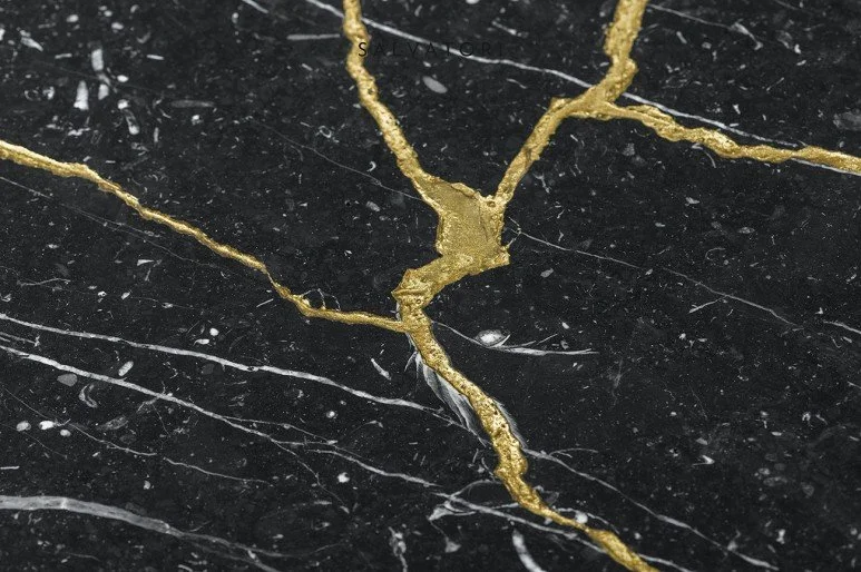 오래되거나 결함이 있어 버려진 석재의 파손 부분을 완전하게 수리한 후, 금 수지로 이어 붙여 재탄생된 석재는 아름다운 제2의 시작을 맞이합니다.