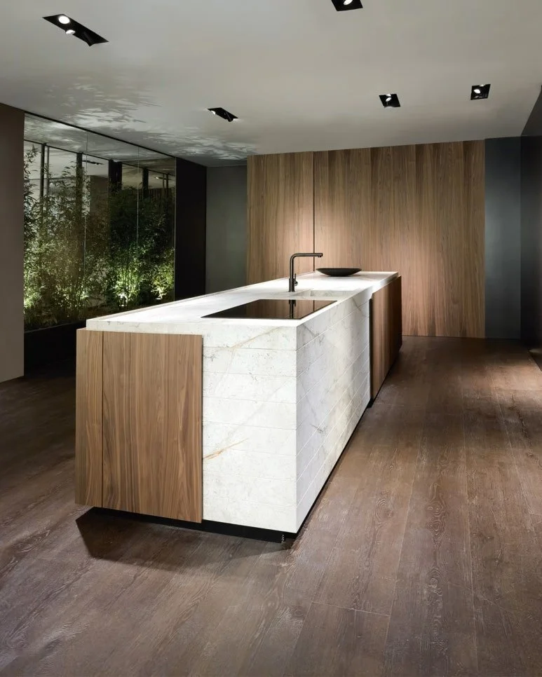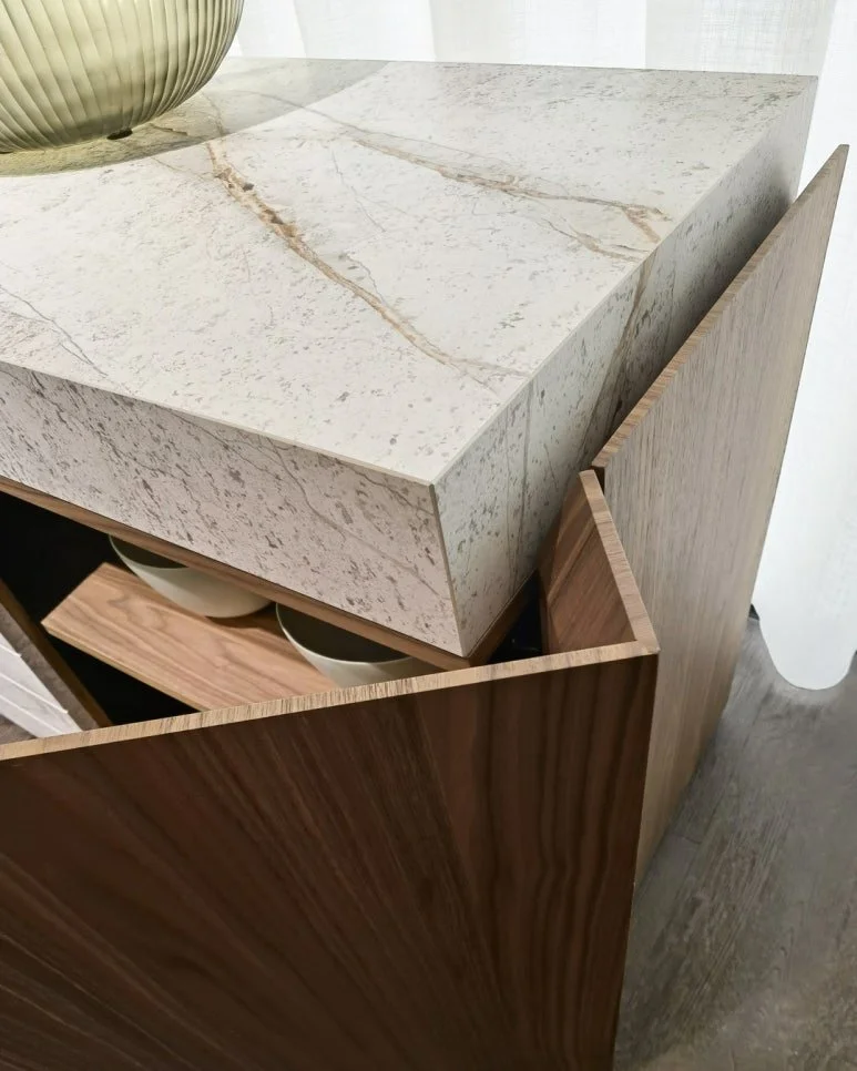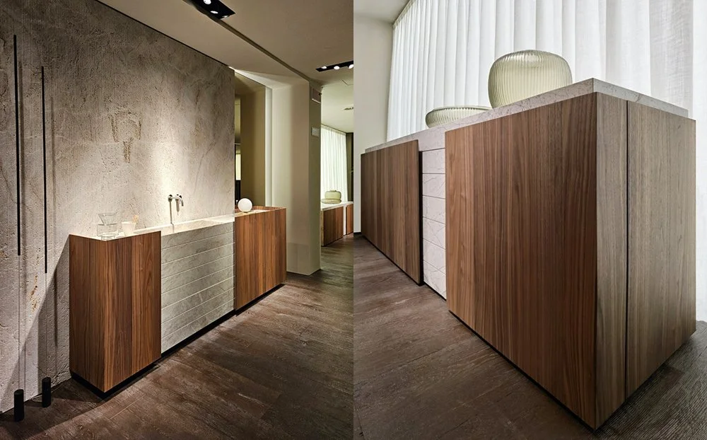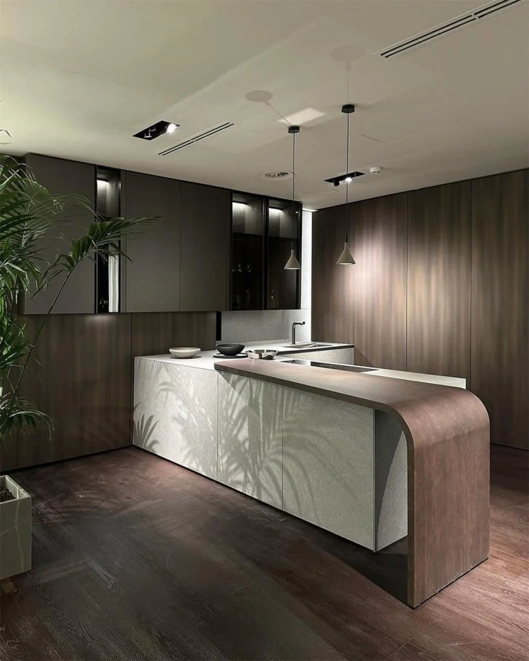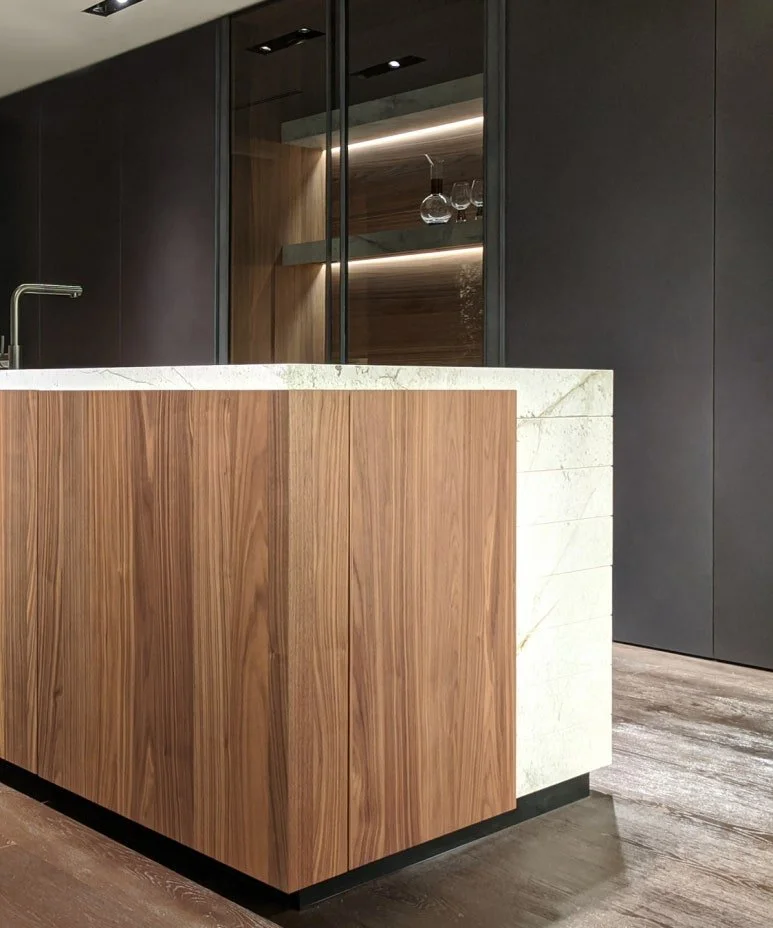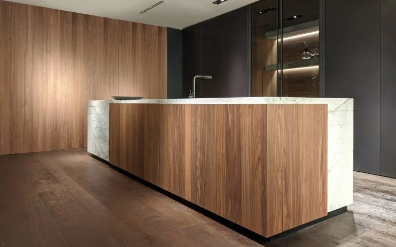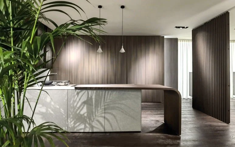 6mm의 슬림한 상판을 특징으로 하는 스킬은 브랜드만의 간결한 미학이 강조된 주방입니다. 모듈노바는 올해, 곡선으로 휘어지는 우드 상판을 가미하여 이색적인 디자인을 시도하였습니다.