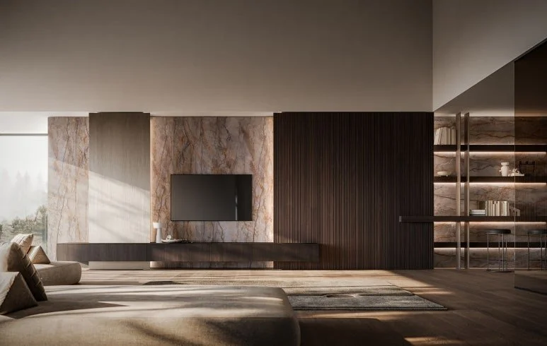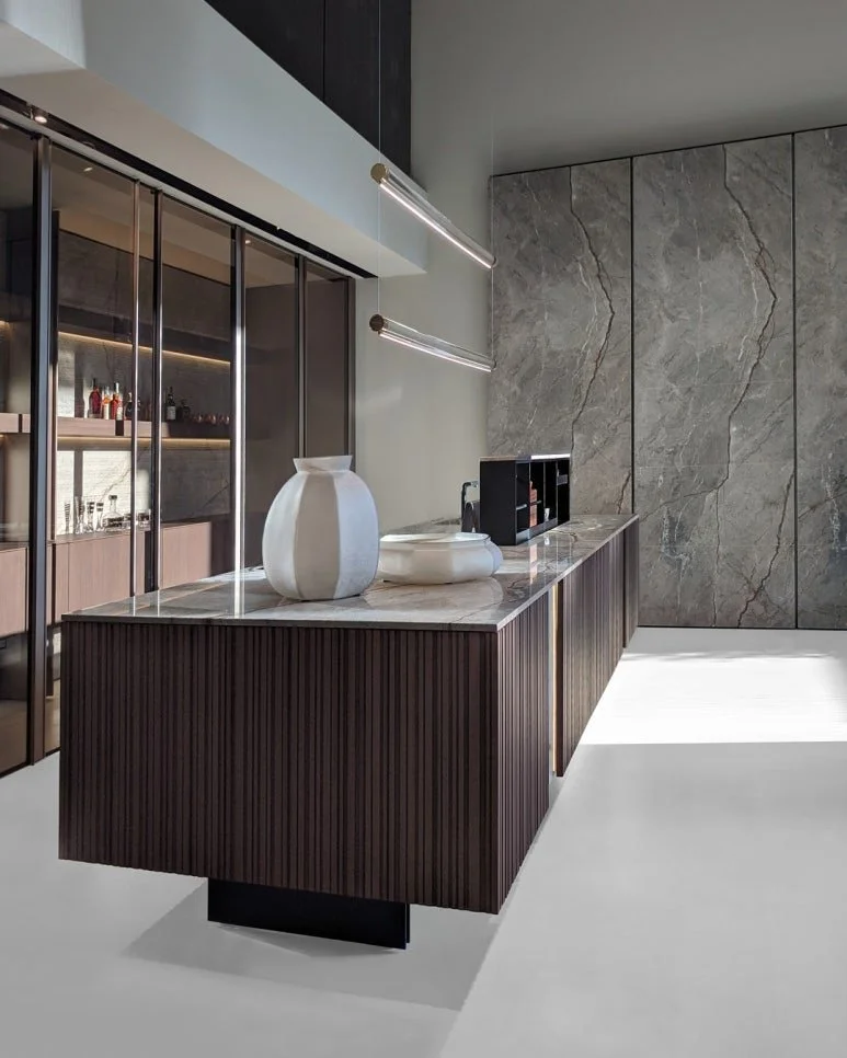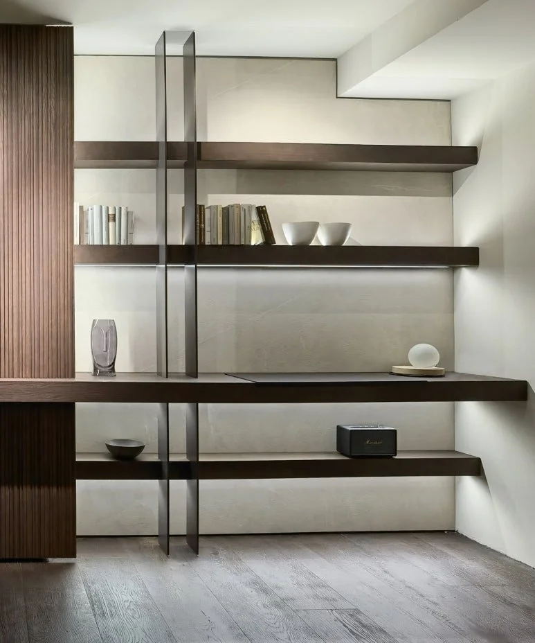한편 홈 바는 브레라(Brera) 북케이스와 자연스럽게 연결되어 다이내믹한 입면을 만듭니다. 입체적인 그루브 패턴과 구조미가 느껴지는 북케이스를 통해 실내에 우아한 리듬감을 표현합니다.