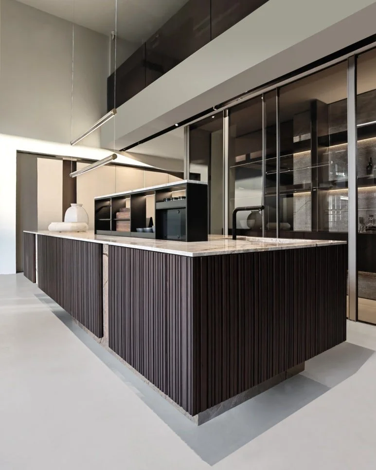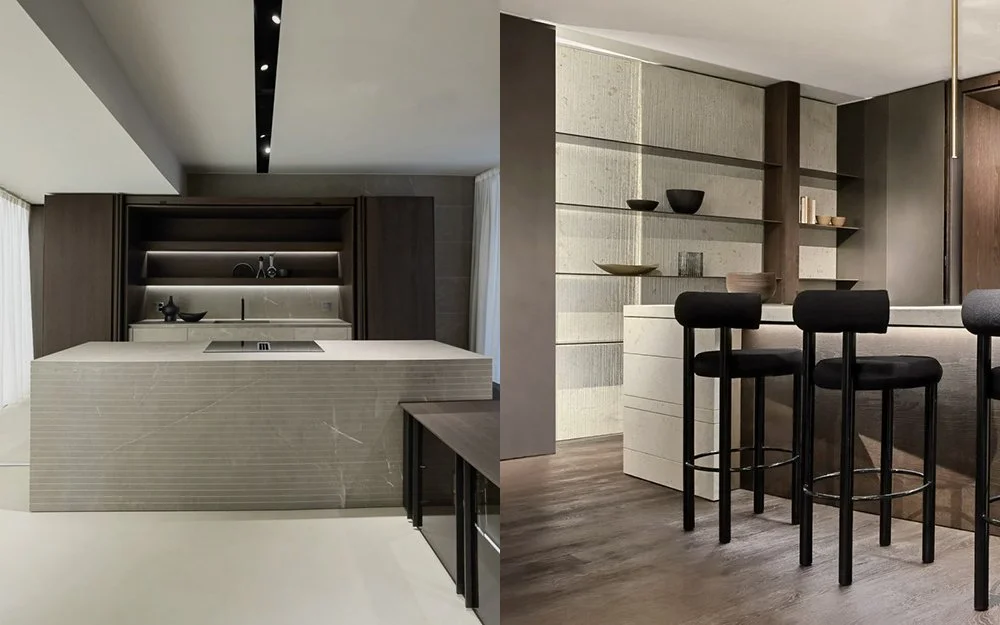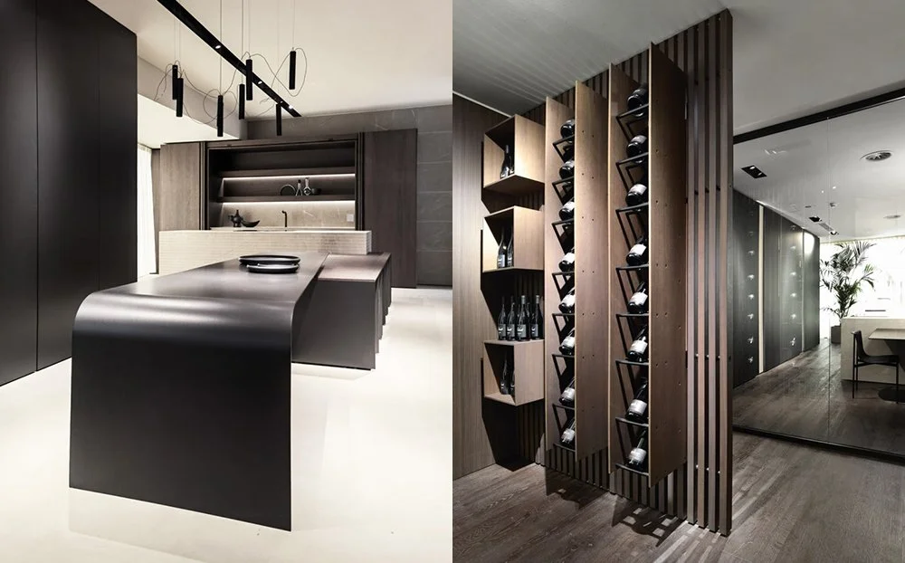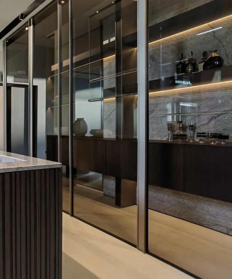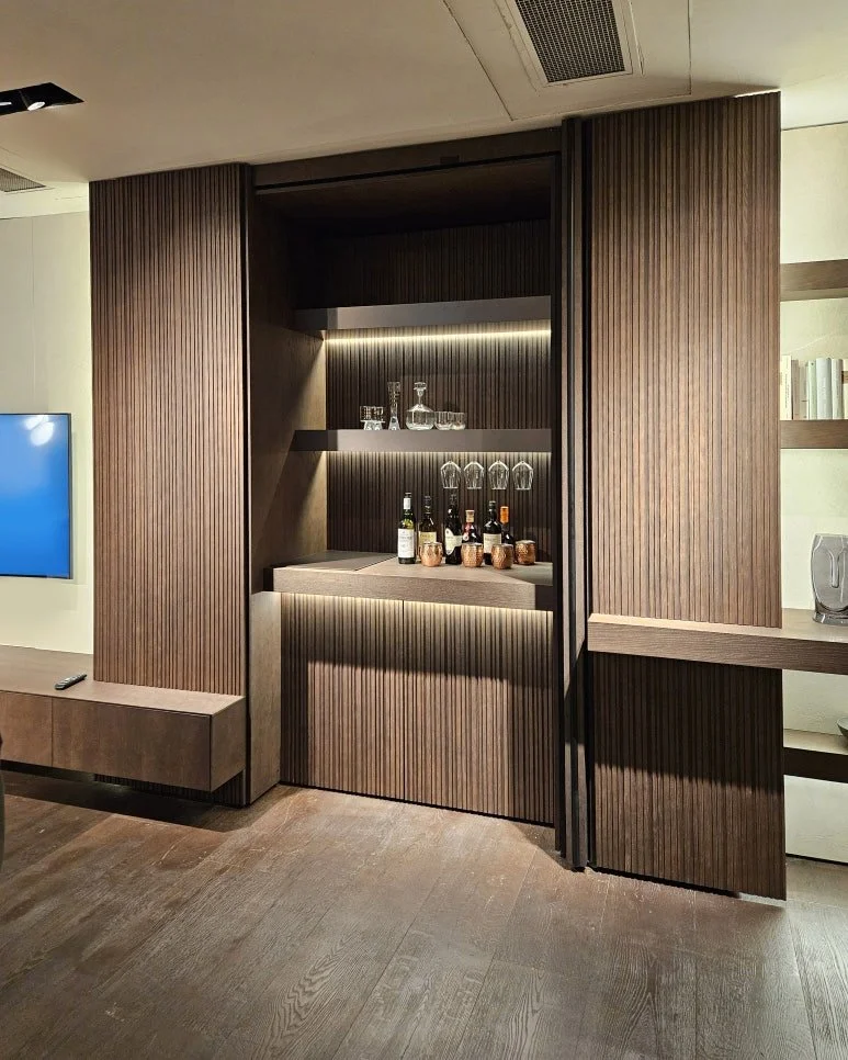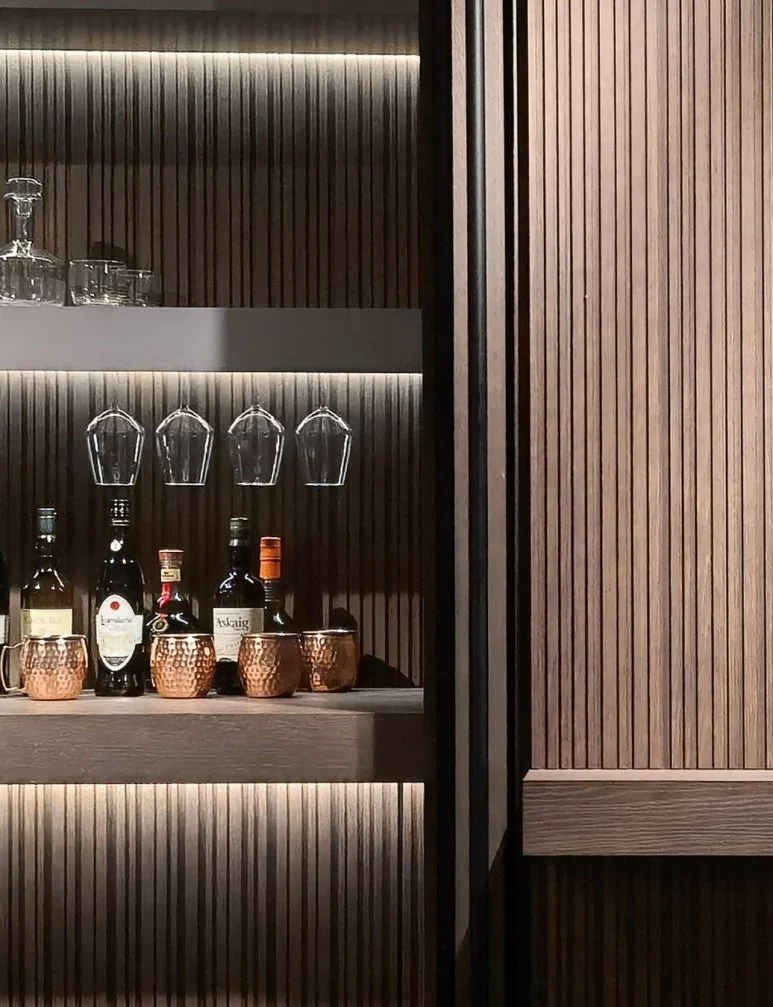 모듈노바의 홈 바 제안. 고스트 오프닝 시스템(Ghost Opening System)과 그루브(Groove) 패턴을 더해 고급스럽고 풍요로운 무드의 바 공간을 완성합니다.