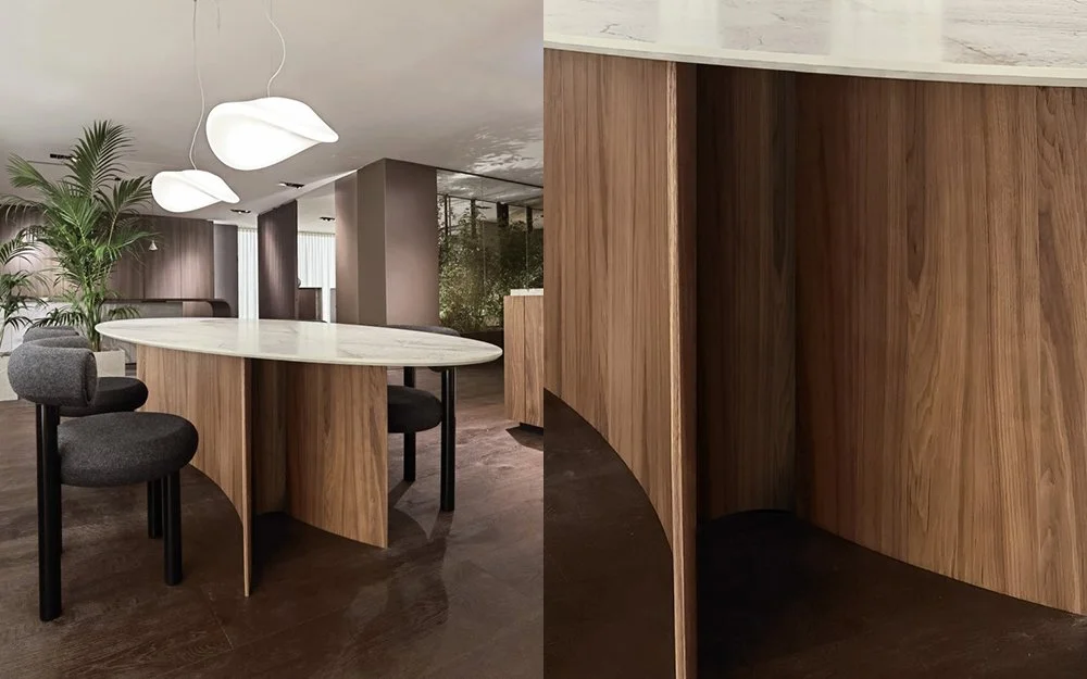 다이닝 테이블에는 완만하게 밴딩된 우드 다리가 접목되어 감탄을 불러 일으킵니다. 도전적인 디자인을 통해 컬렉션이 가진 예술적 아이텐티티를 잘 표현합니다.