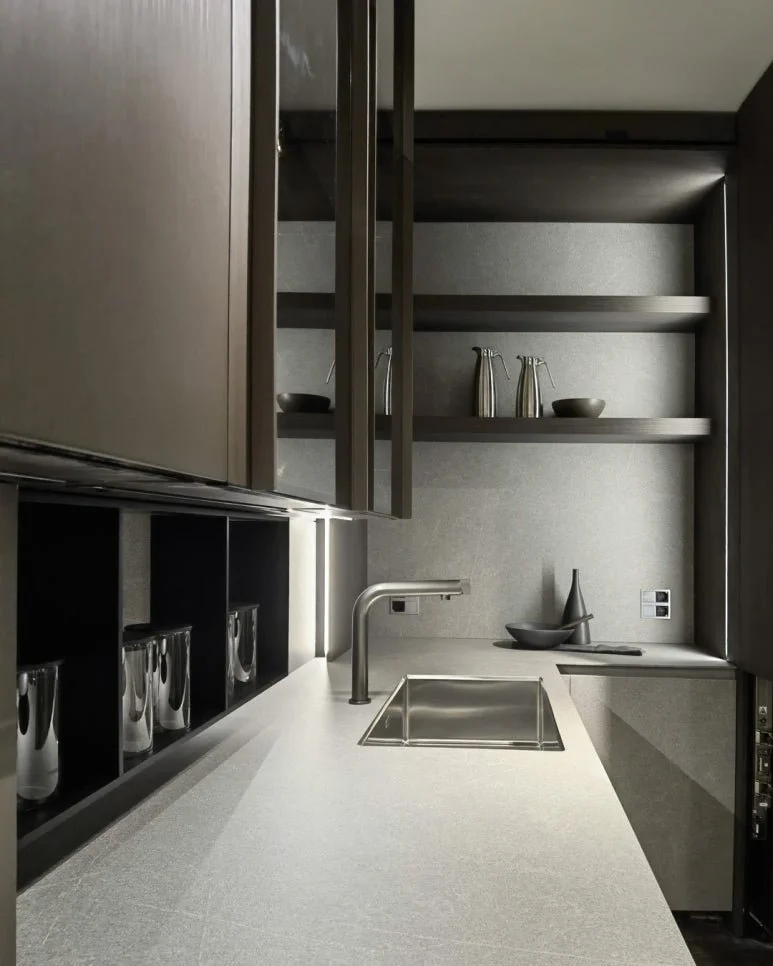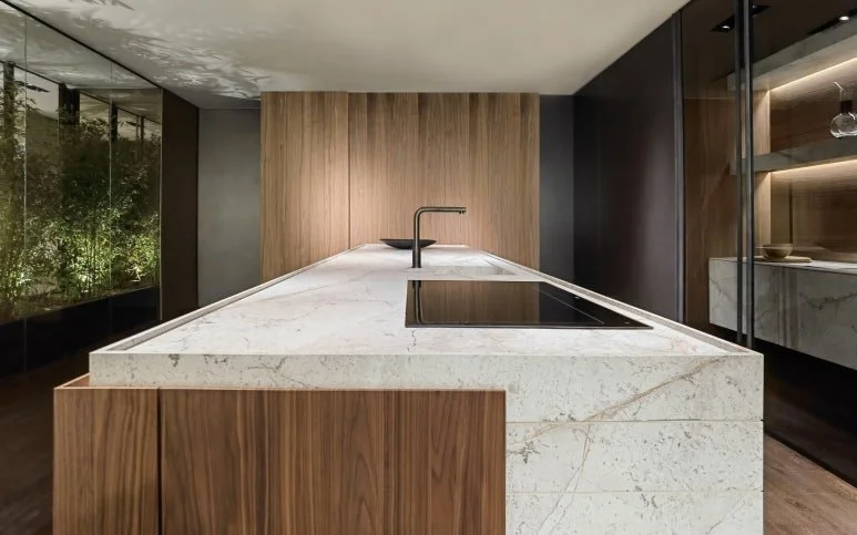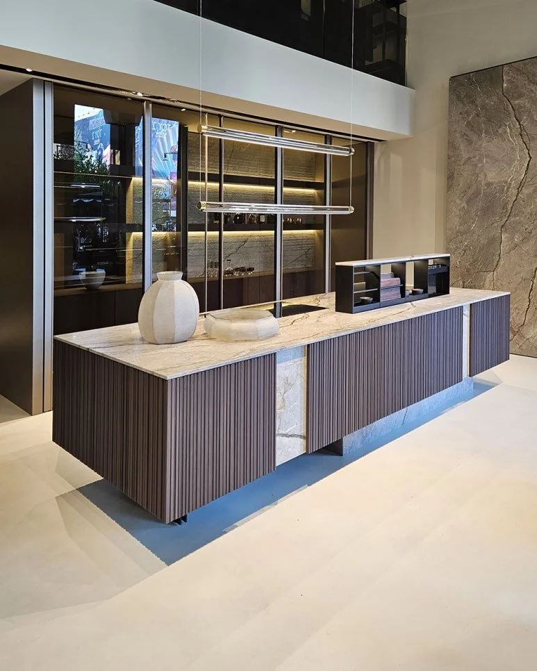 주방의 경우, 컬렉션만의 예술적인 디테일을 한 눈에 확인할 수 있습니다. 카운터 탑의 엣지 디자인에서부터 그 정교함이 여실히 살아납니다.
