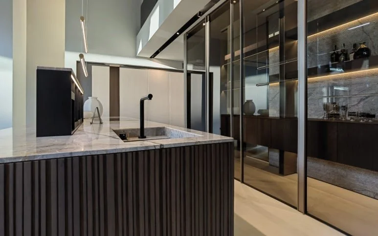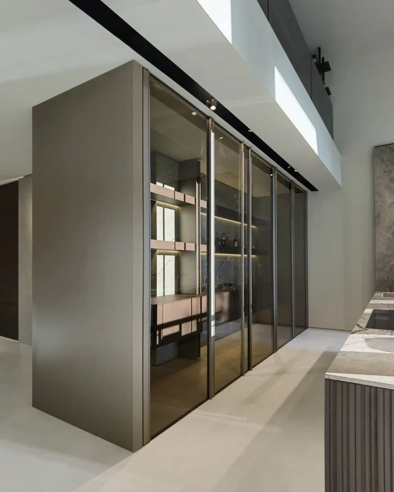 아일랜드 뒷편에는 신규 도어 시스템 글래스(Glass)가 디스플레이되어 눈길을 끕니다. 빌리코(Bilico) 도어의 글래스 버전으로서, 혁신적인 시공 시스템을 특징으로 합니다.