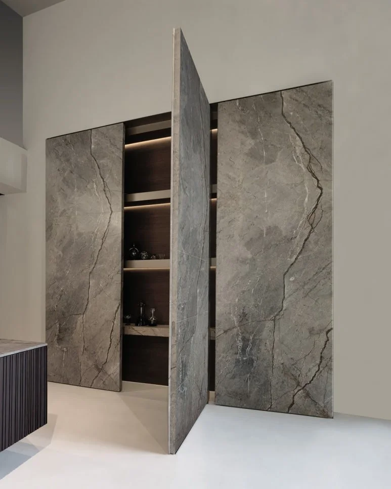 실버 루츠 대리석(Silver Roots Marble)으로 제작했으며, 브랜드의 독자 기술인 허니콤 구조를 적용하여 내부 무게를 혁신적으로 줄였습니다. 대리석 도어로 실내에 극강의 웅장함과 압도감을 전합니다.