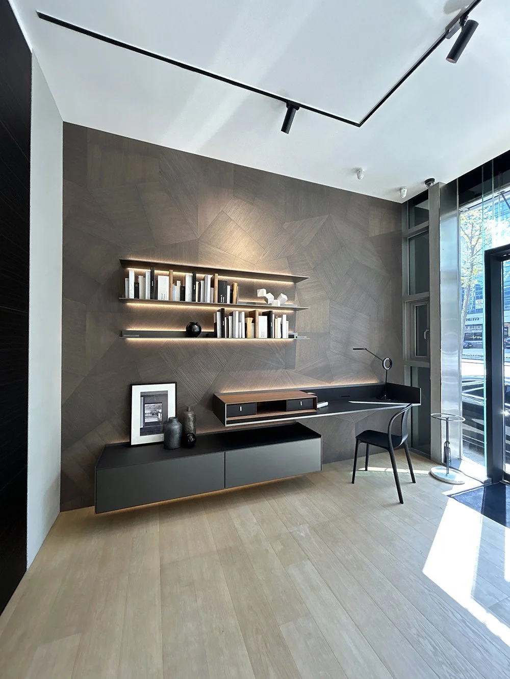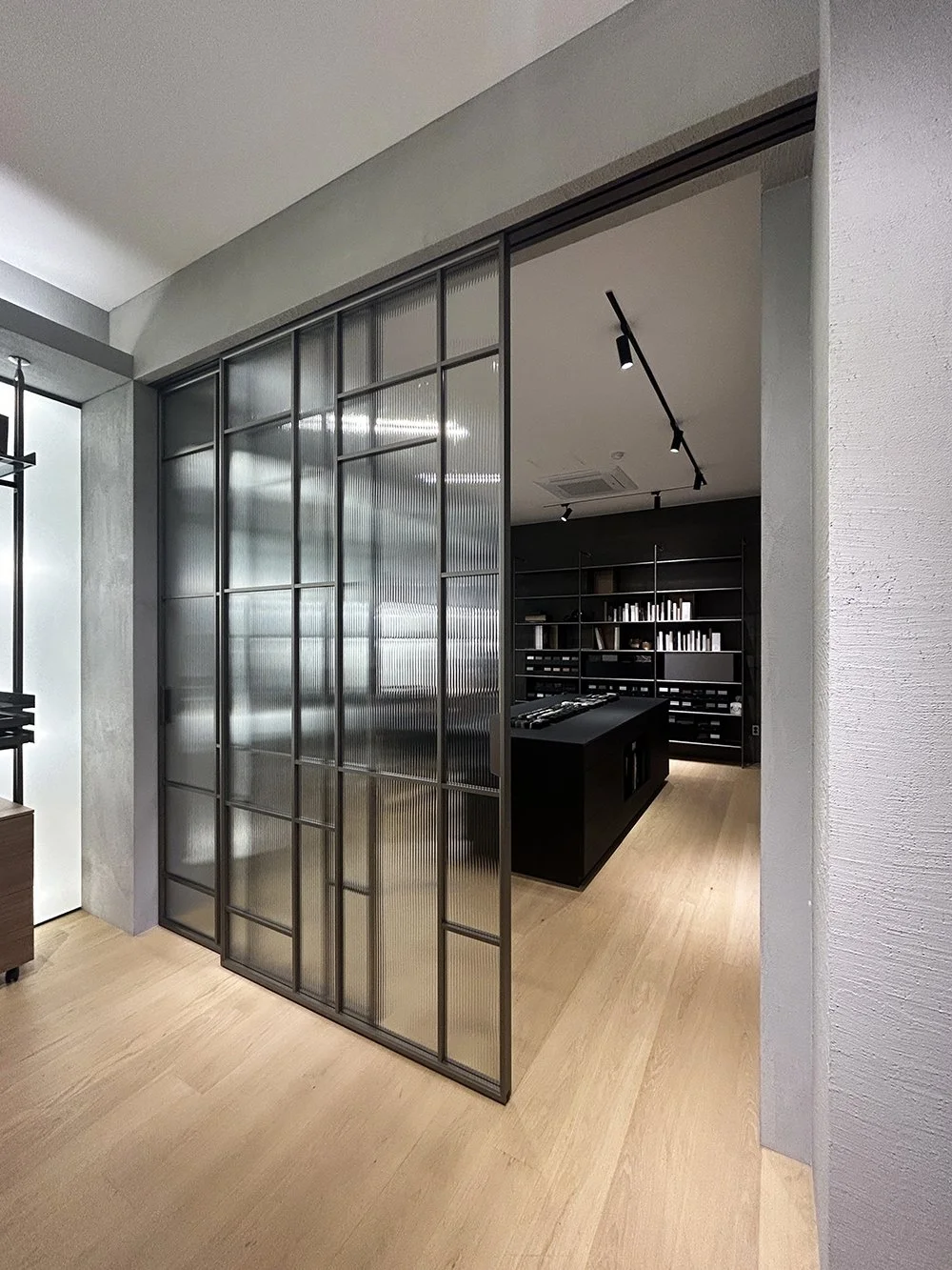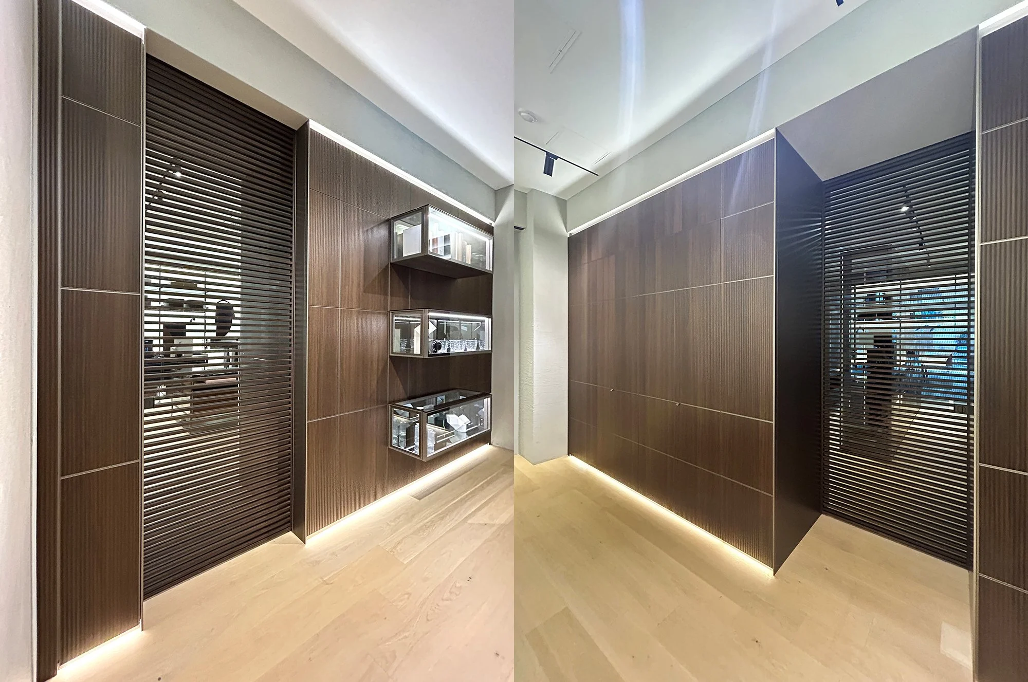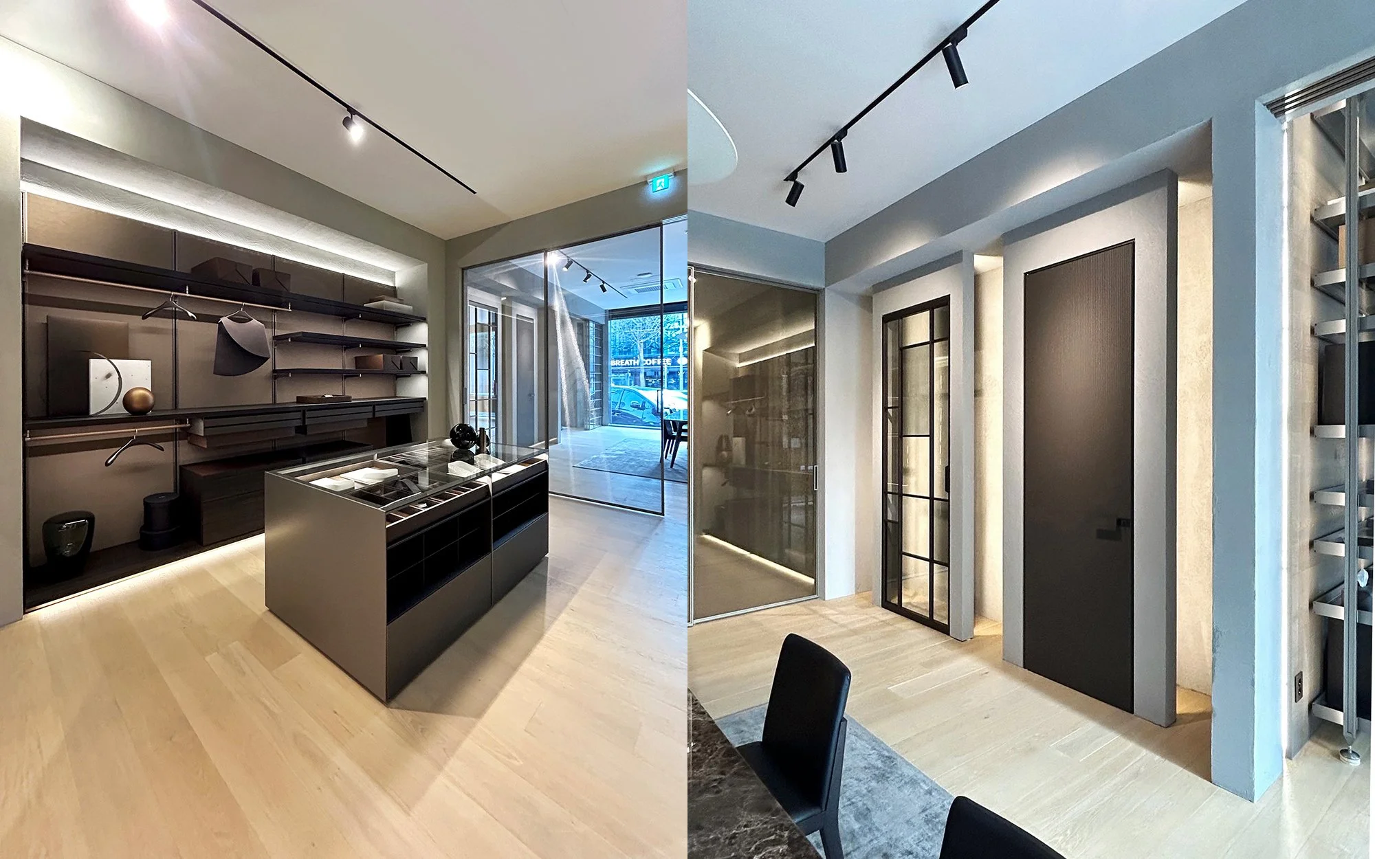 쇼룸의 경우, 우드 베니어(19 Rovere Termotrattato)를 통해 따스함을 높였으며, 포켓 도어 구성으로 공간 활용도를 높였는데요.
