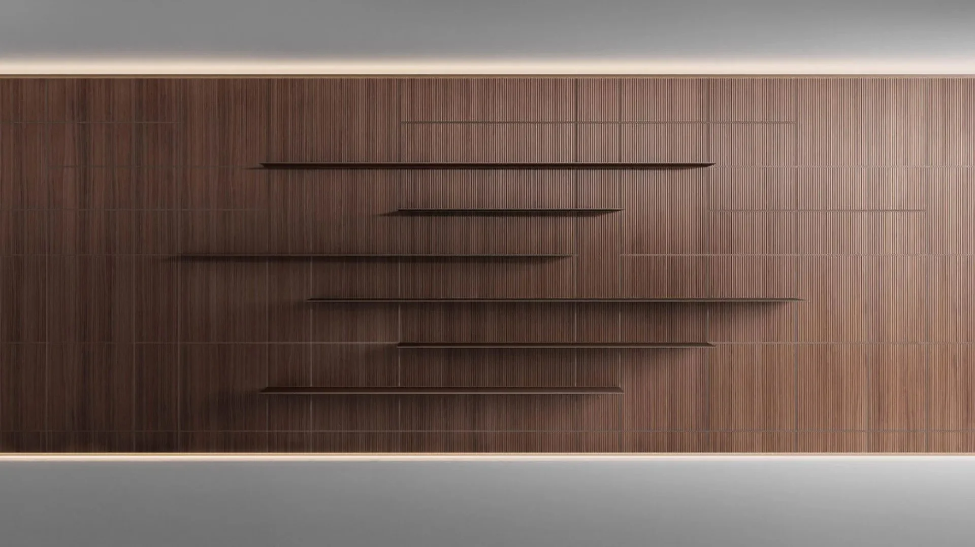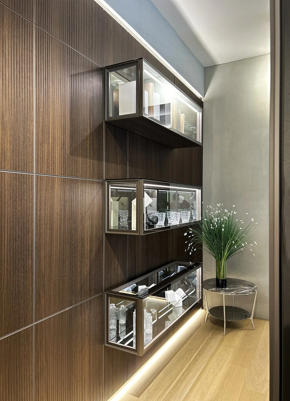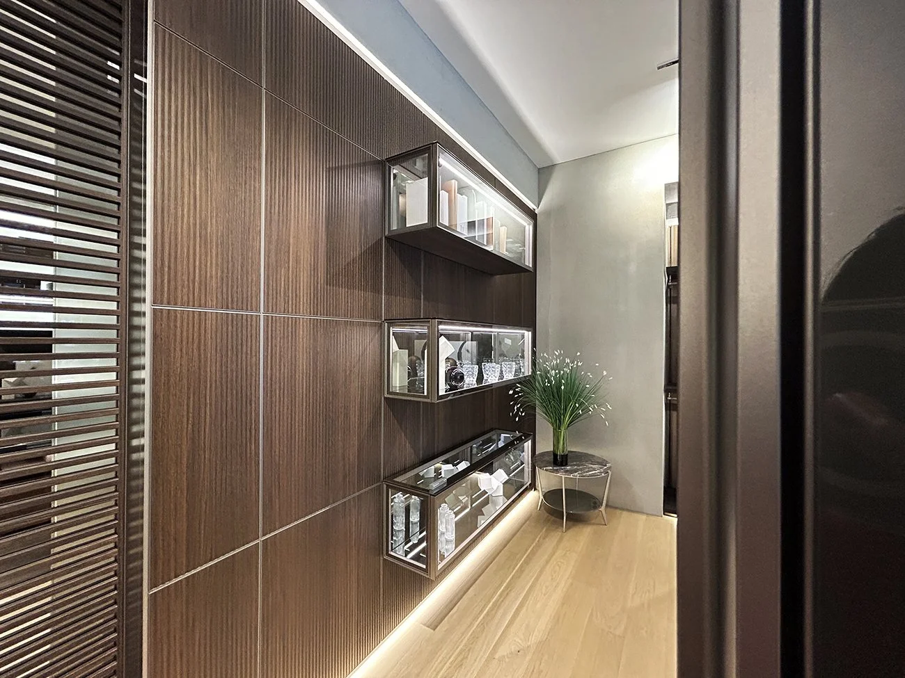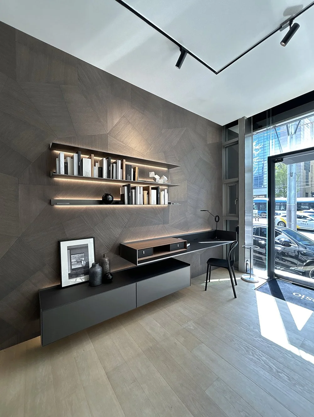 쇼룸에는 우아한 20 로베레 테르모트라타도 사하라(Rovere Termotrattato Sahara) 우드로 벽면을 마감해 품격을 높입니다.