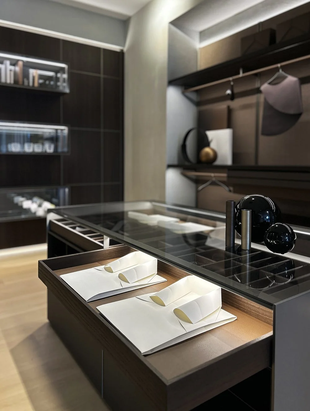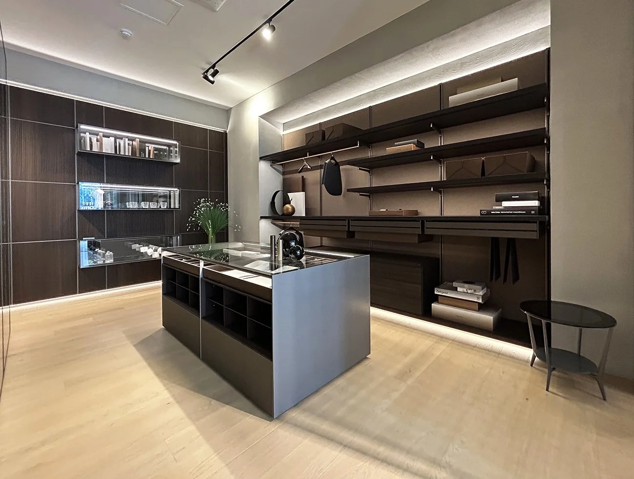 알테어는 브랜드의 신규 드레스룸 아일랜드로서, 상부 슬라이딩 액세서리 트레이가 포인트가 됩니다.