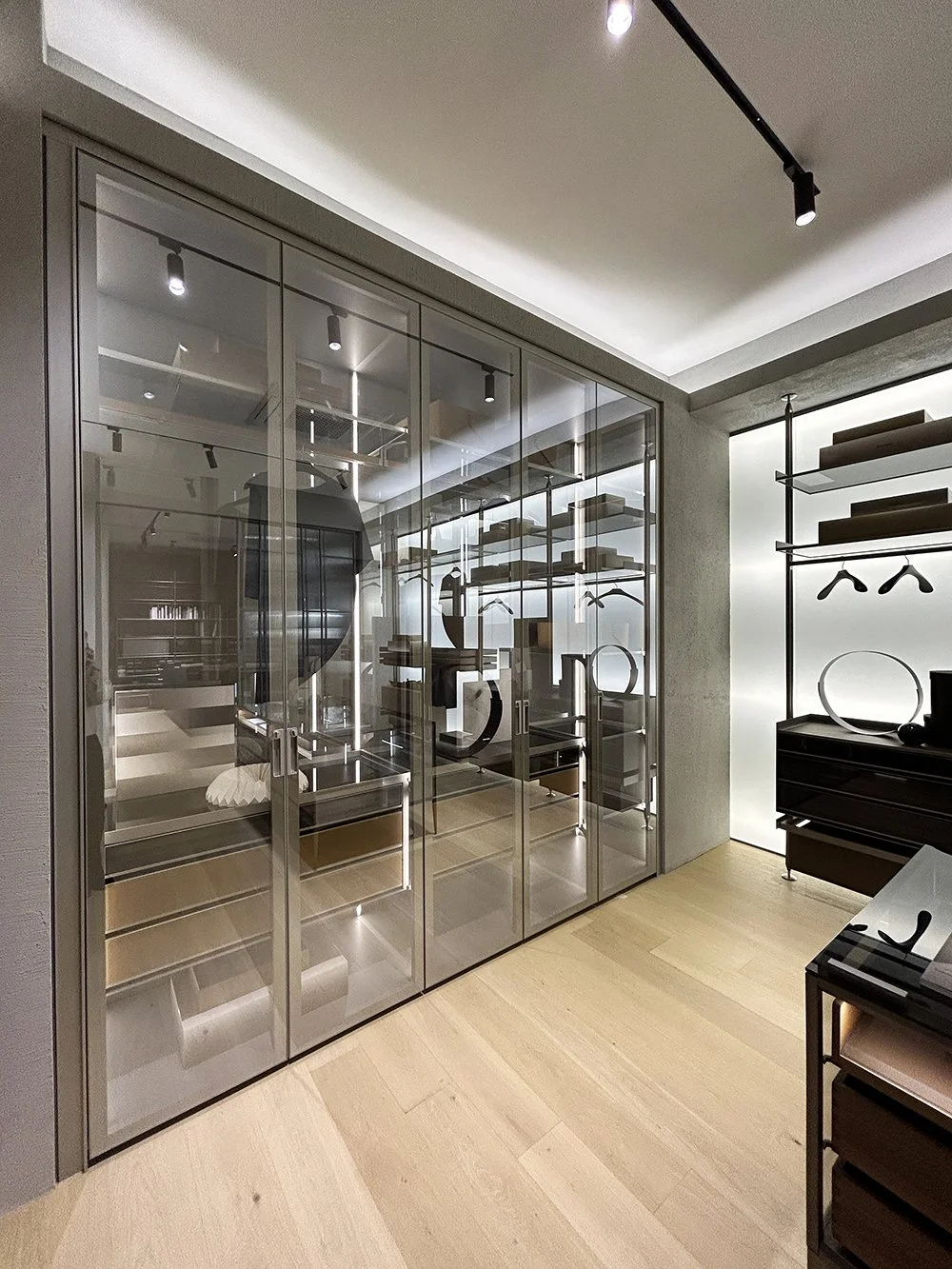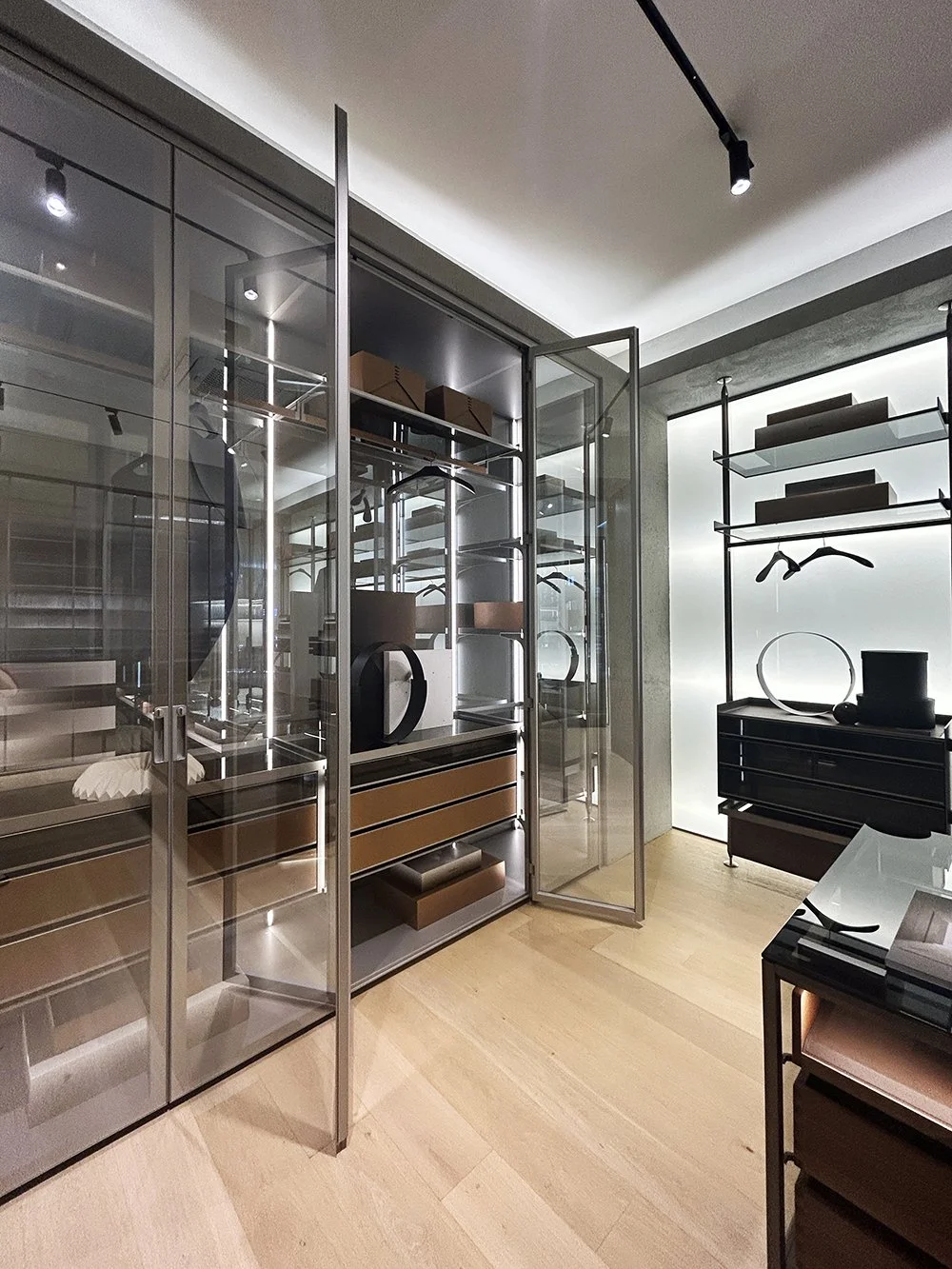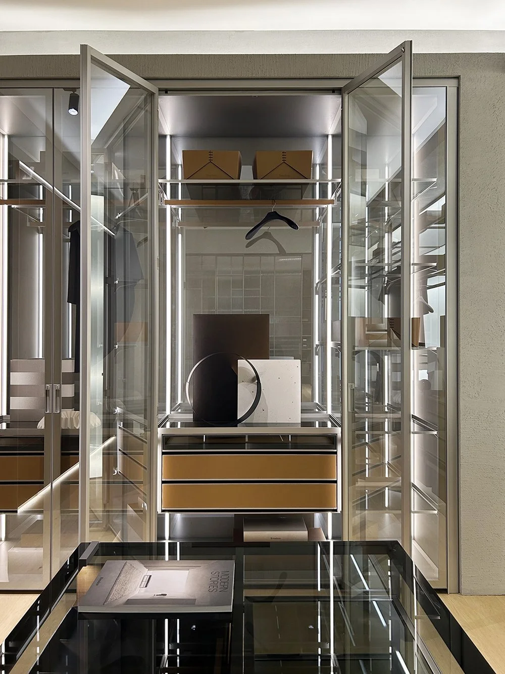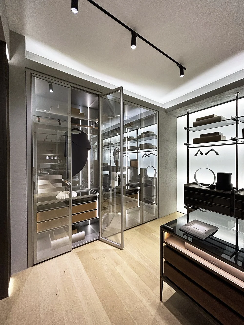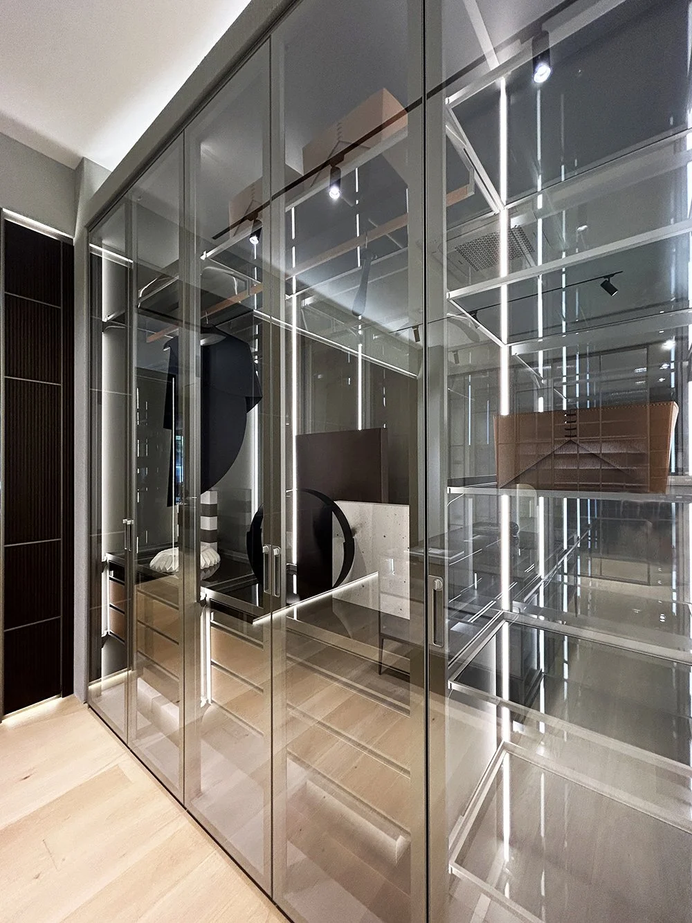 글래스, 알루미늄 특화 기술을 잘 보여주는 드레스룸 라인업으로, 오차 없이 균일하게 맞아 떨어지는 글래스와 알루미늄이 시선을 단숨에 사로잡습니다.