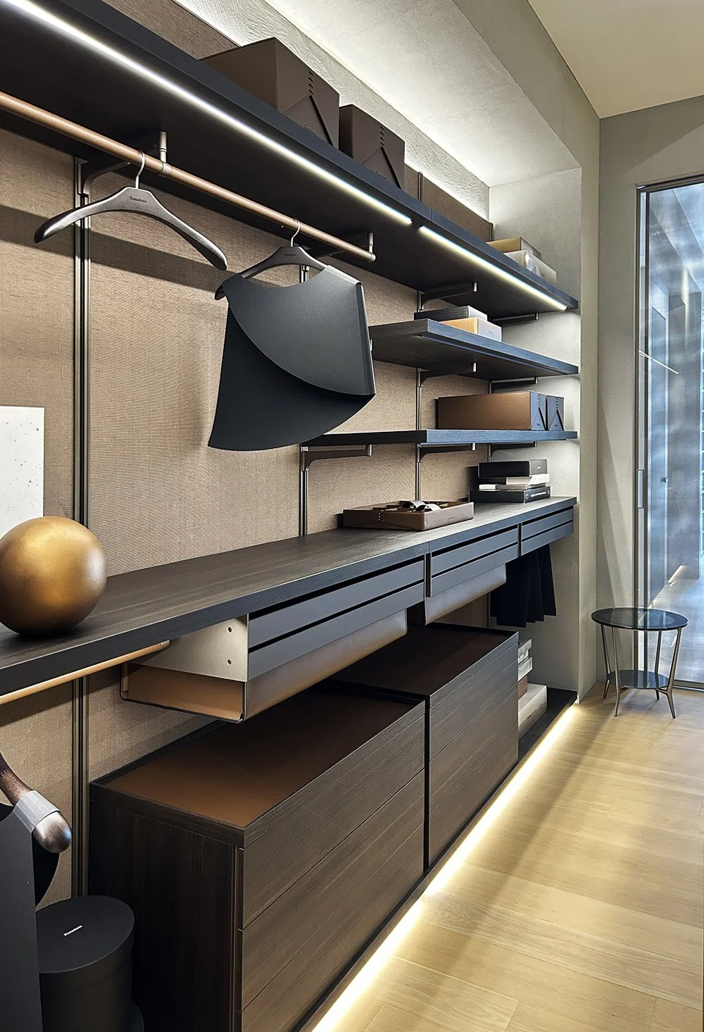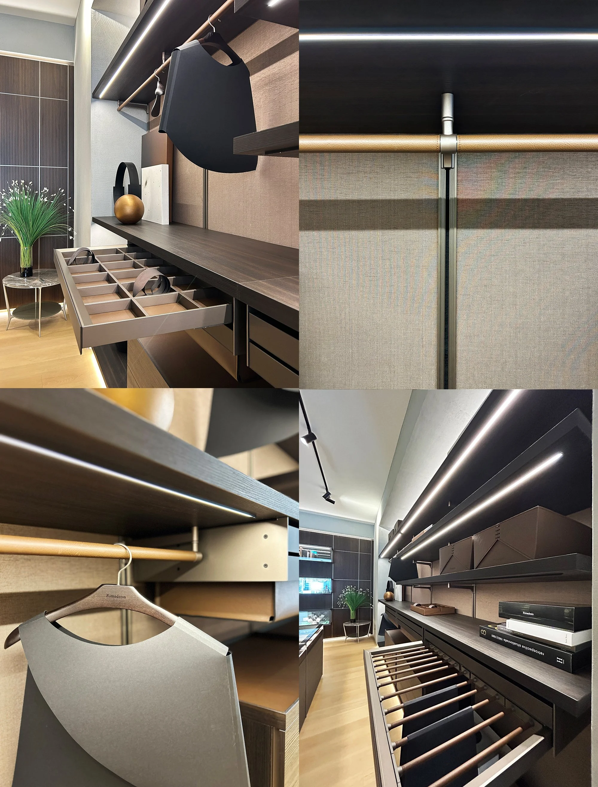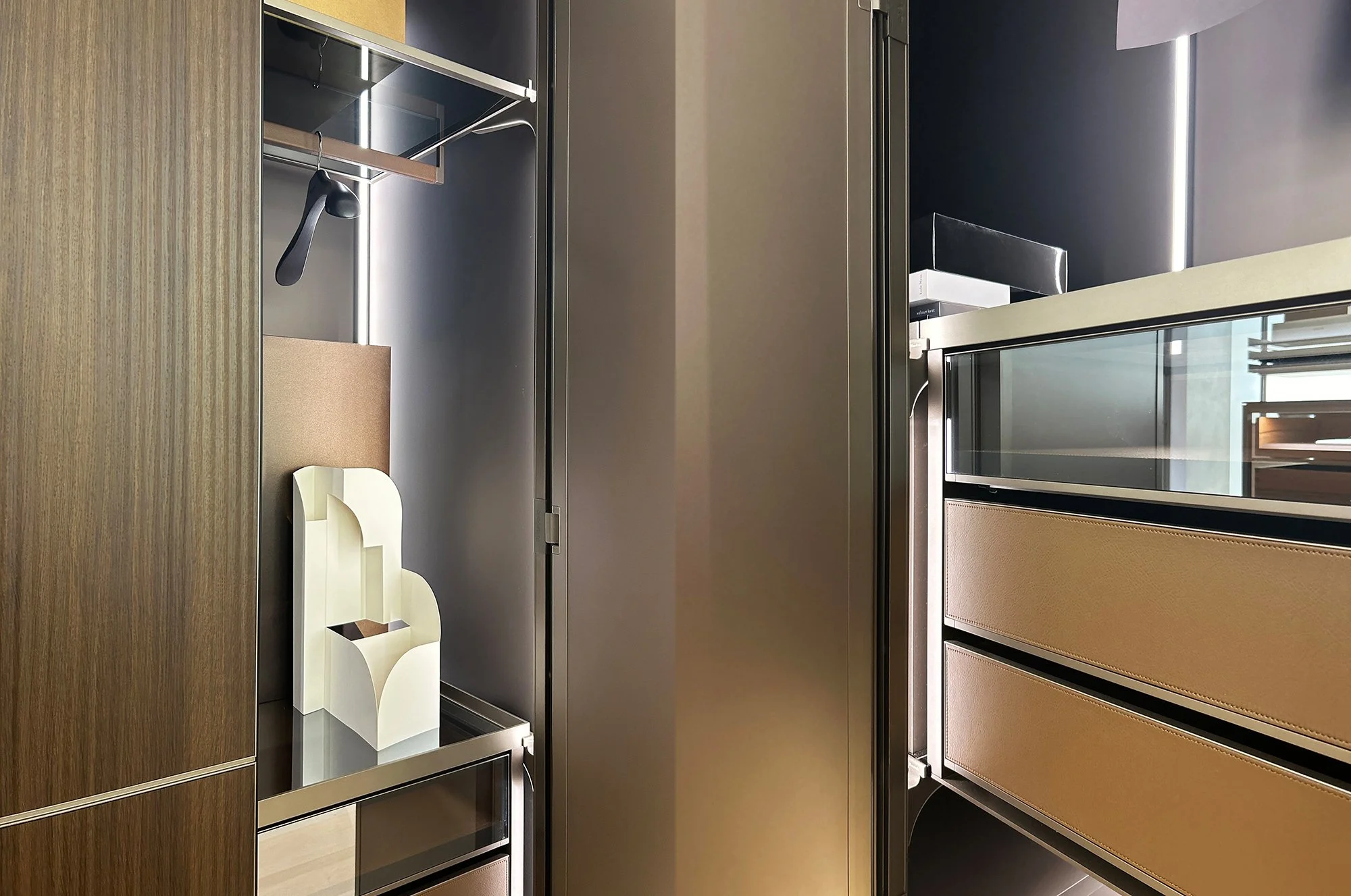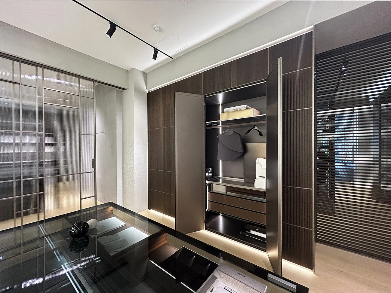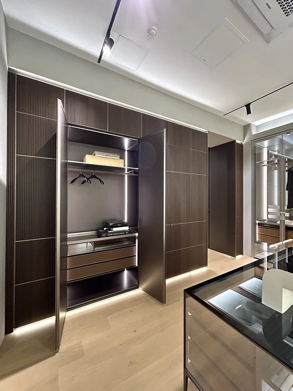 글래스, 알루미늄 특화 기술을 잘 보여주는 드레스룸 라인업으로, 오차 없이 균일하게 맞아 떨어지는 글래스와 알루미늄이 시선을 단숨에 사로잡습니다.