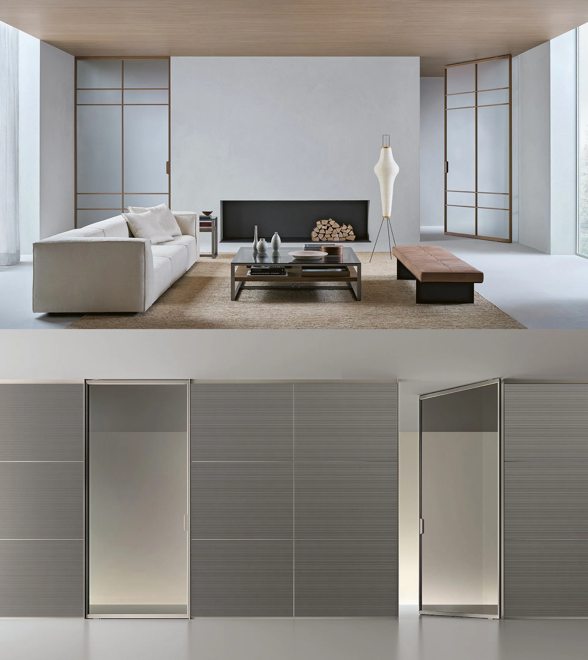 도어 당 최대 폭 1,500mm, 최대 높이 2,925mm까지 커스터마이징되고, 특허 빌트 인 레일 시스템을 통해 슬라이딩 도어, 포켓 도어, 코너 구성 등 실내 조건에 맞추어 완전히 통합됩니다.