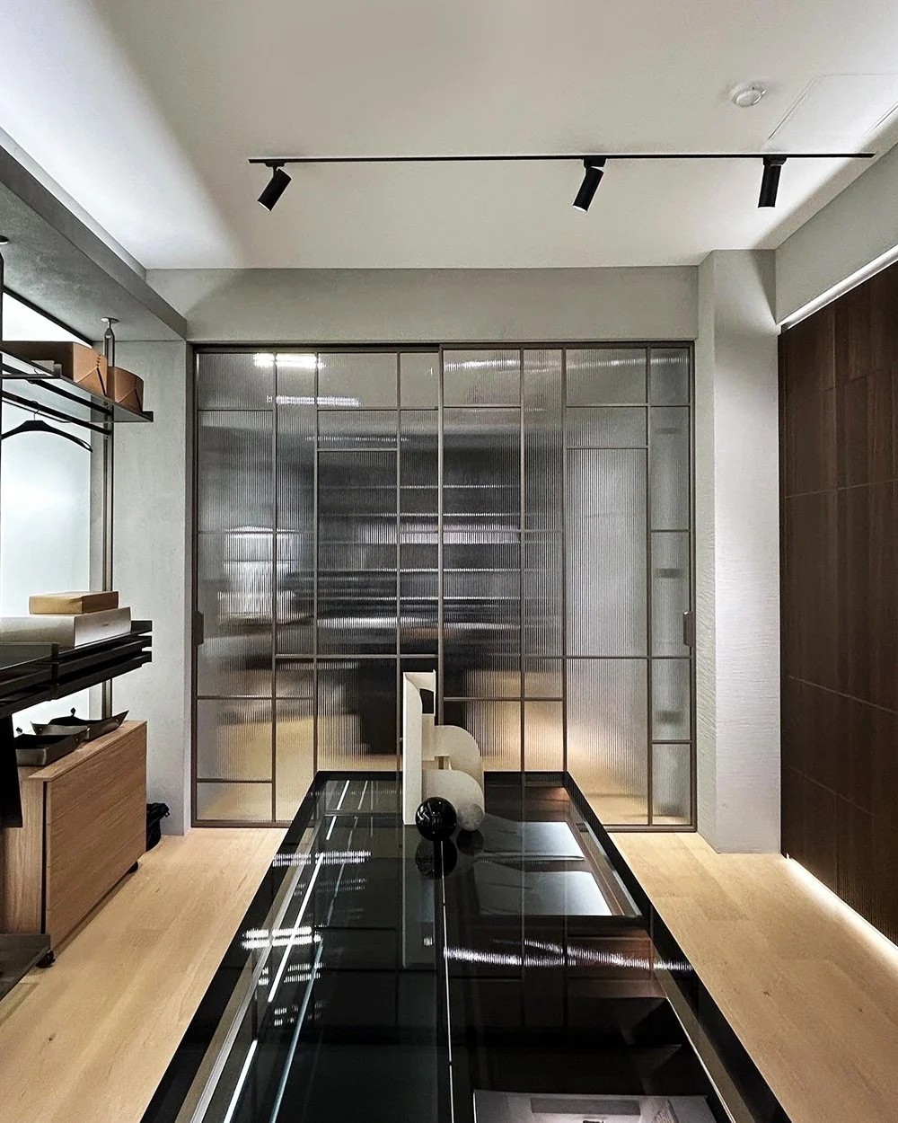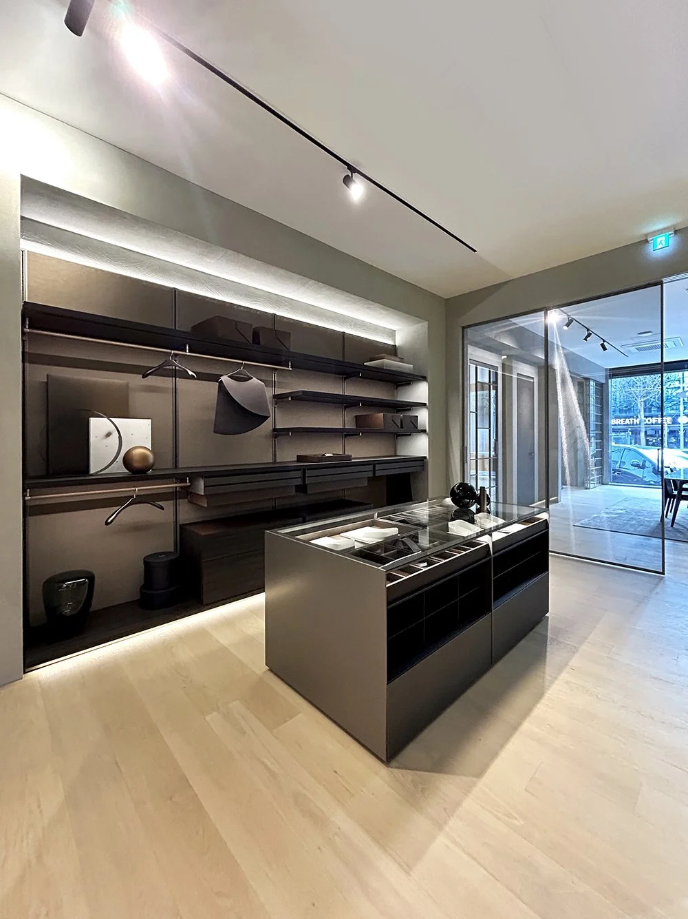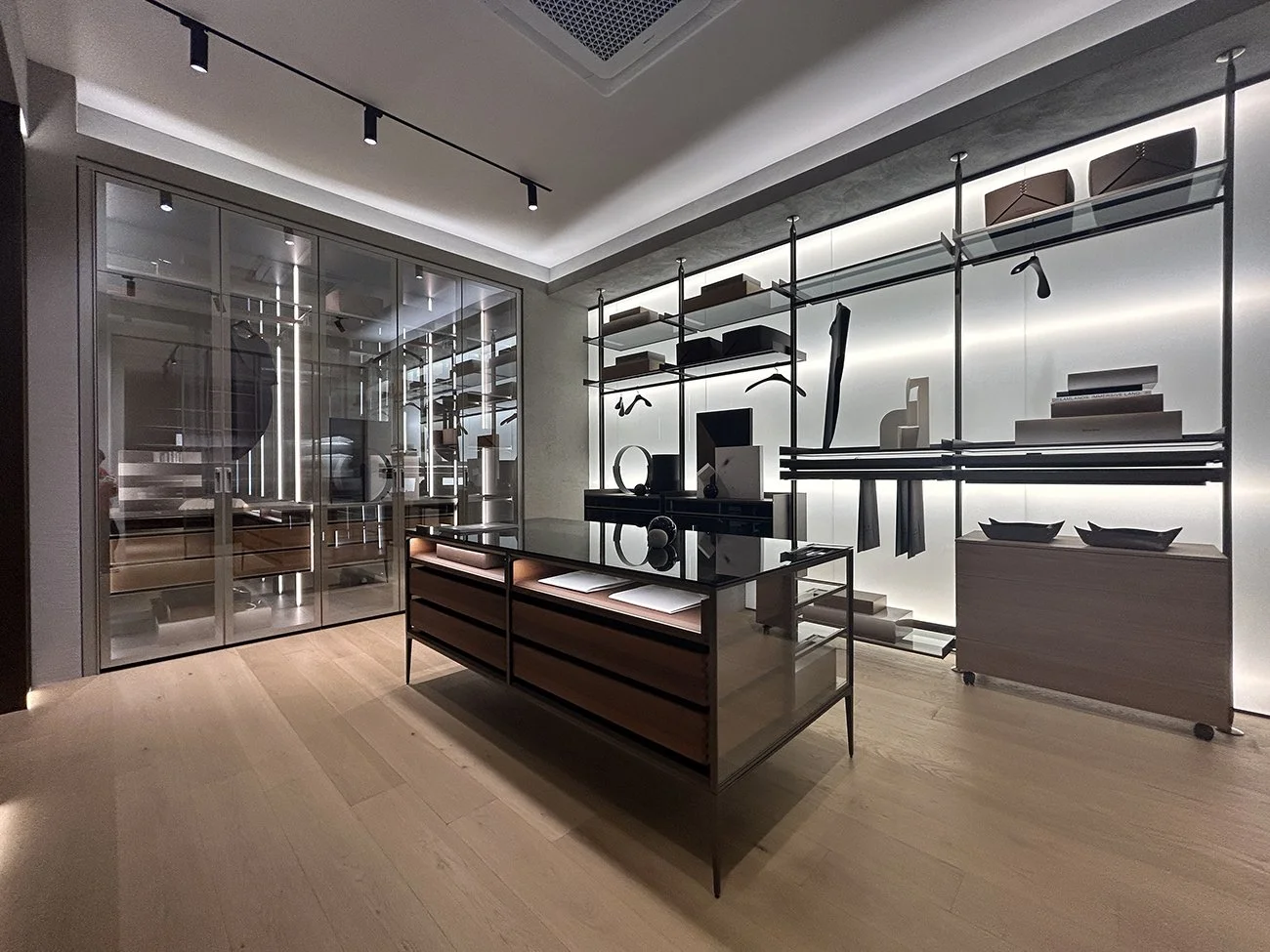 쇼룸에는 정교한 감각을 자아내는 590 사하라 트라스파렌테(Sahara Trasparente) 글래스와 303 브론조(Bronzo) 알루미늄 프레임이 적용되었습니다.