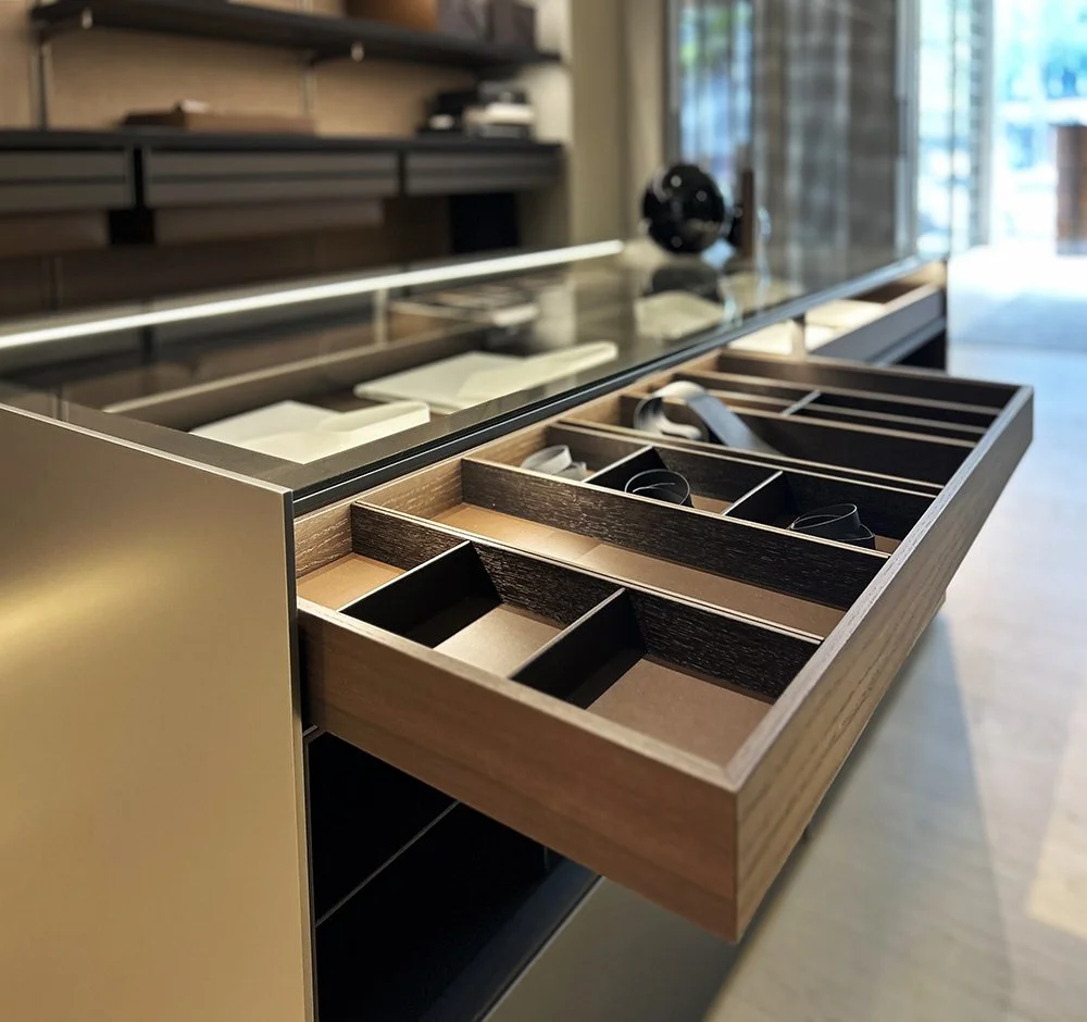 풀 아웃(pull-out) 구조로 설계된 트레이는 소프트 클로징 매커니즘이 적용되어 부드럽게 밀고 당겨 다양한 액세서리 아이템을 꺼내도록 도와 줍니다.
