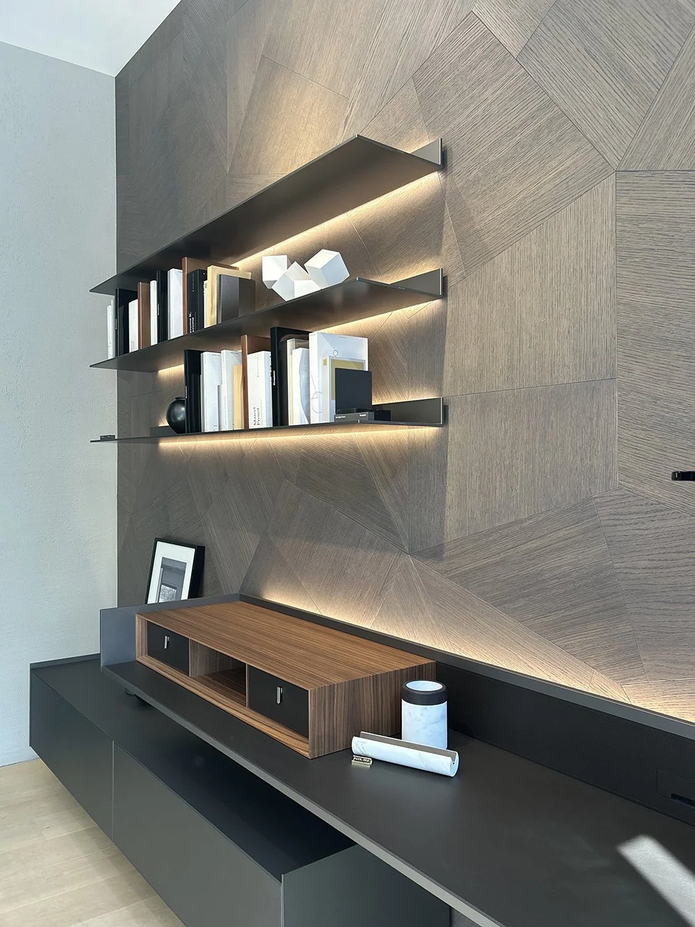 따스함이 깃든 T012 마르모타(Marmotta) 패브릭으로 백 패널을, 무게감을 더하는 멜라미니코(Melaminico Larice Carbone) 우드로 선반 및 수납을 마감하였습니다.