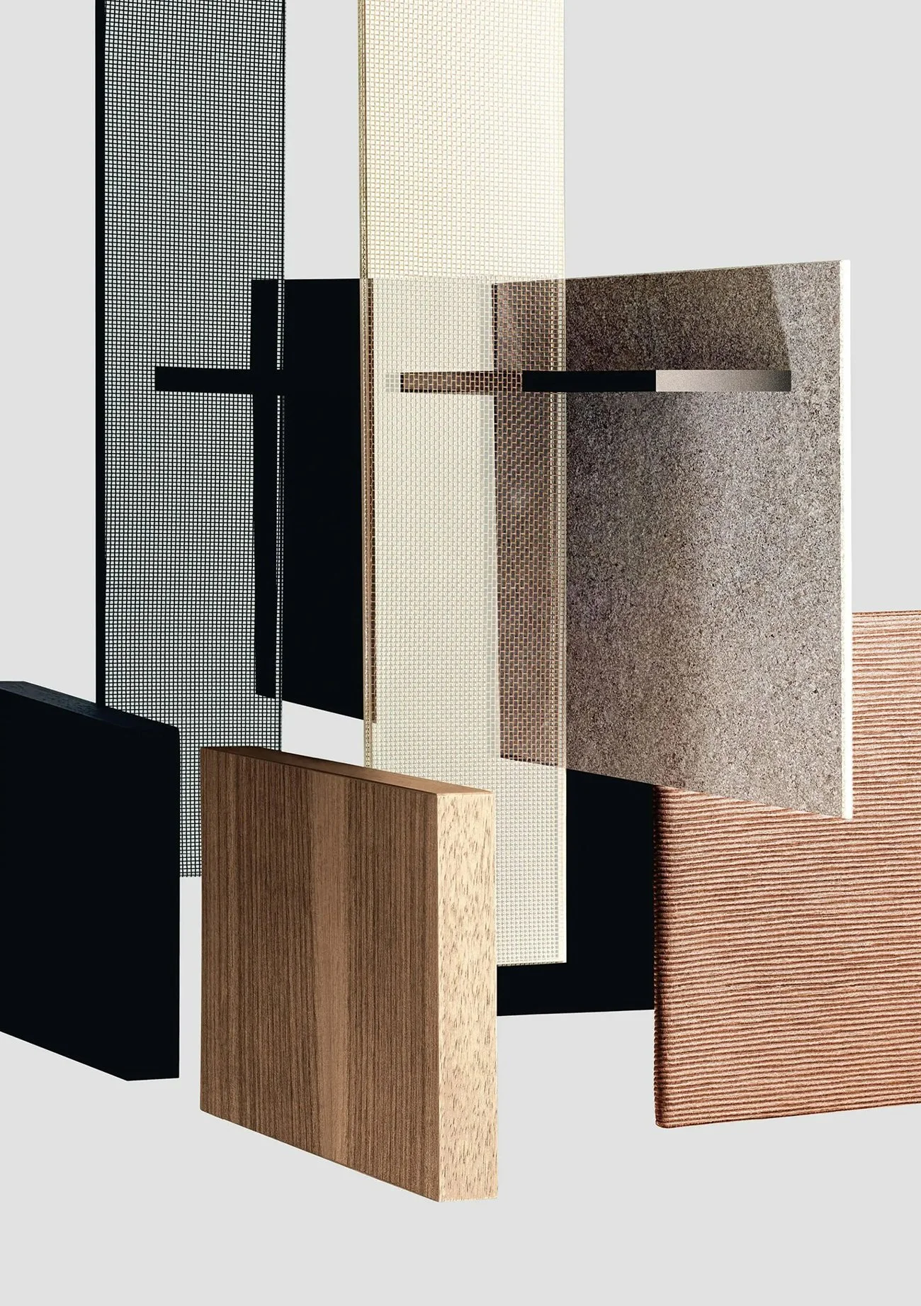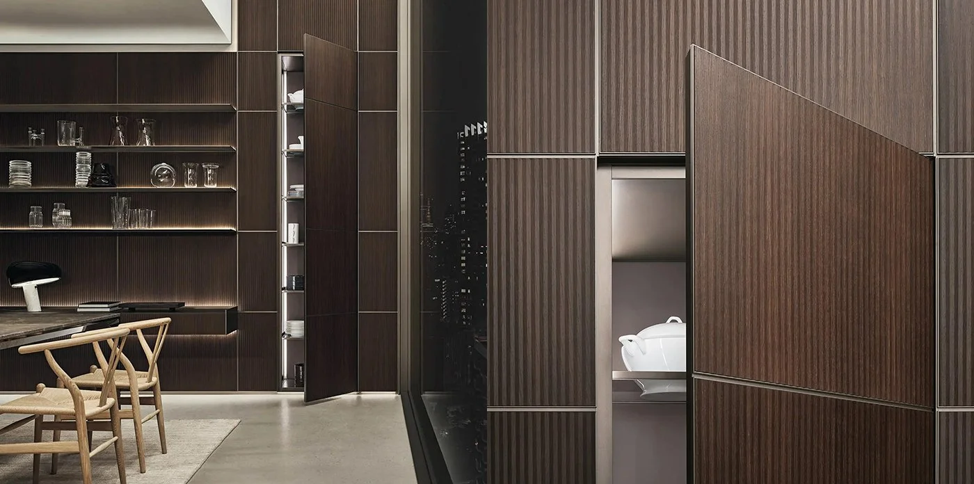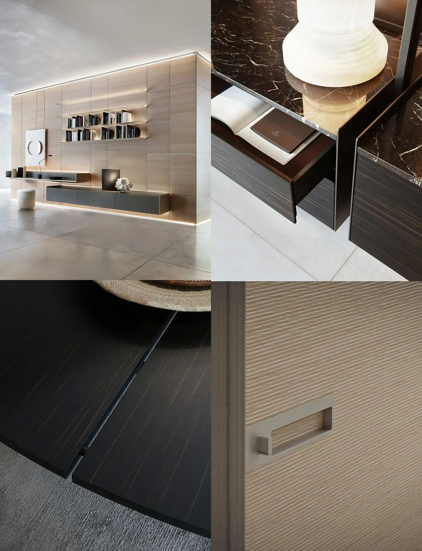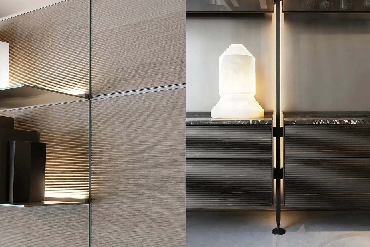 리마데시오가 2022년 밀라노 디자인 위크에서 새롭게 선보인 마감입니다. 우드 소재에 수평으로 뻗어나가는 입체적인 줄무늬 패턴을 새겨 모던함과 클래식함이 함께 공존합니다.