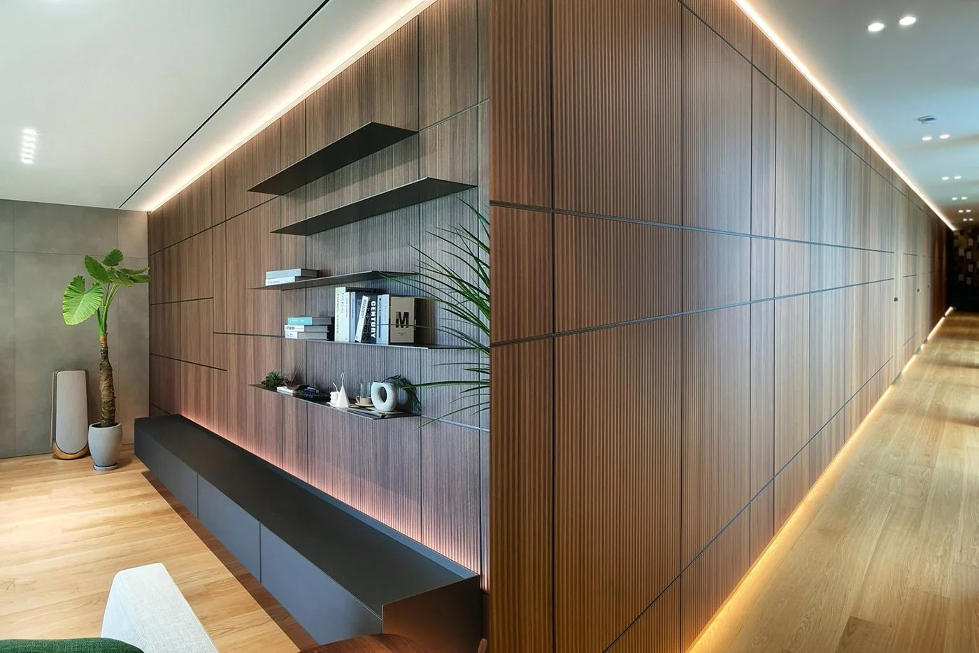 따이가 우드 마감은 사하라 우드와 같이 모듈러 월 패널링을 비롯해 스윙 도어, 드로워, 테이블 상판 등에 폭 넓게 적용할 수 있습니다.