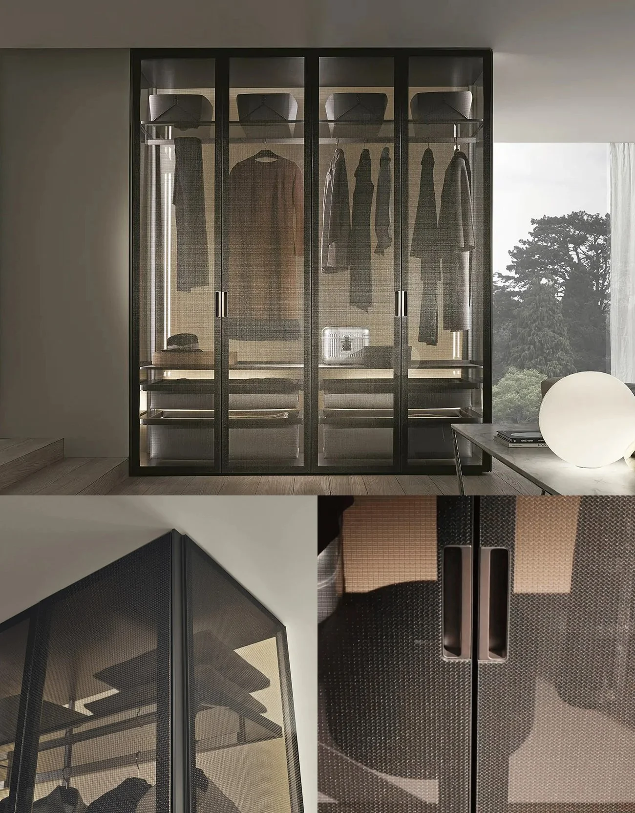 기존 메쉬 글래스에서 한층 진보된 신규 마감입니다. 브론즈 컬러의 얇은 금속 실이 섬세하게 교차되는 치밀한 짜임이 돋보입니다.