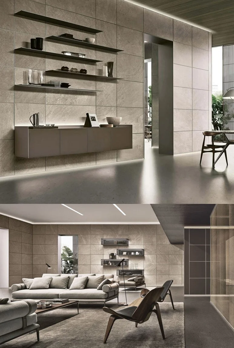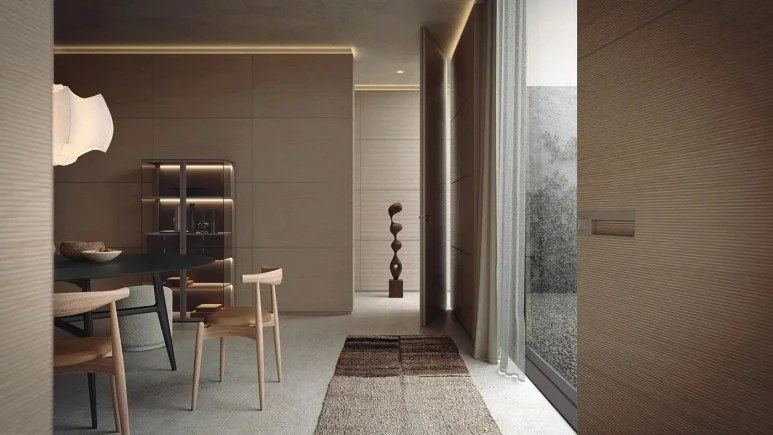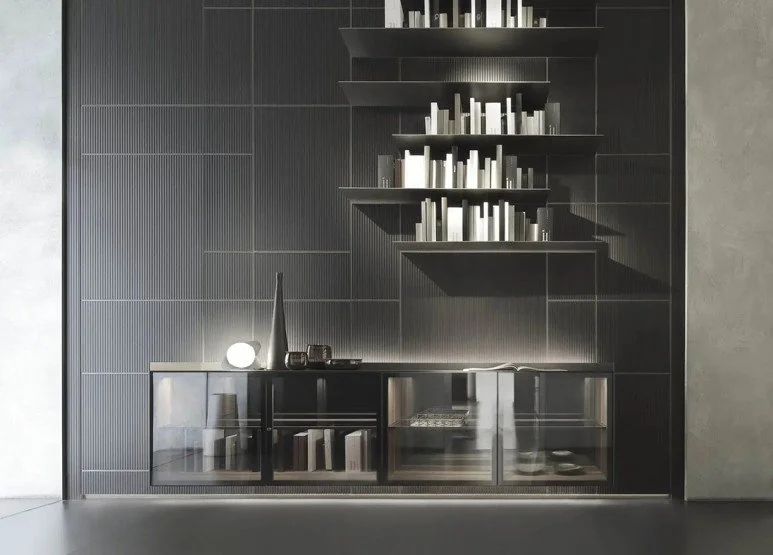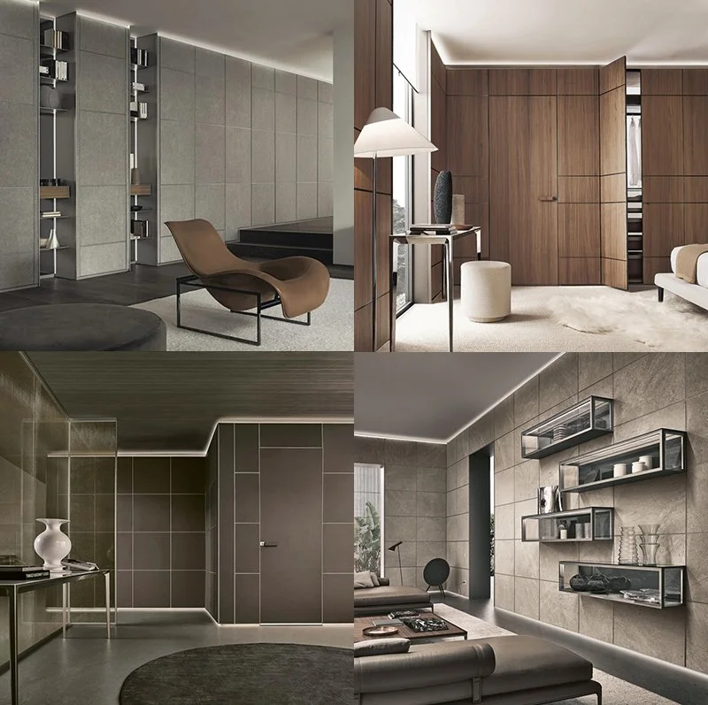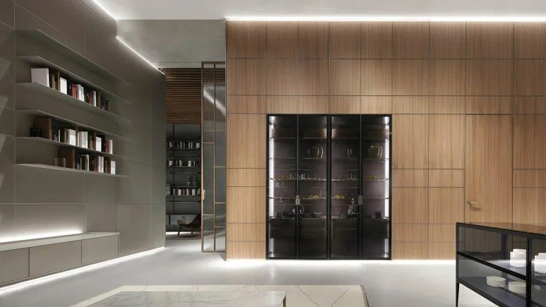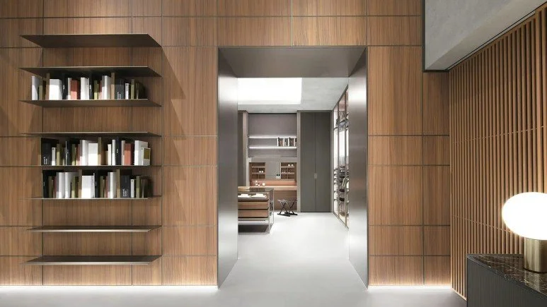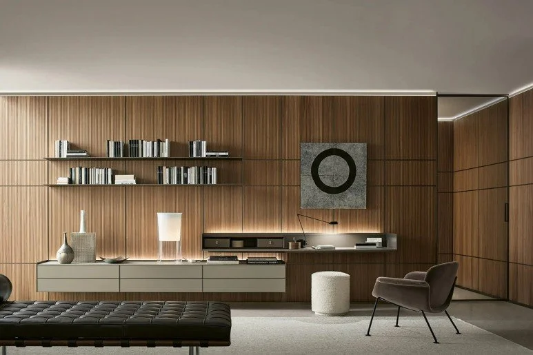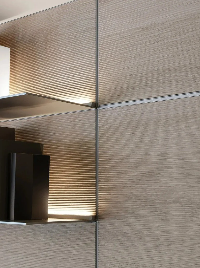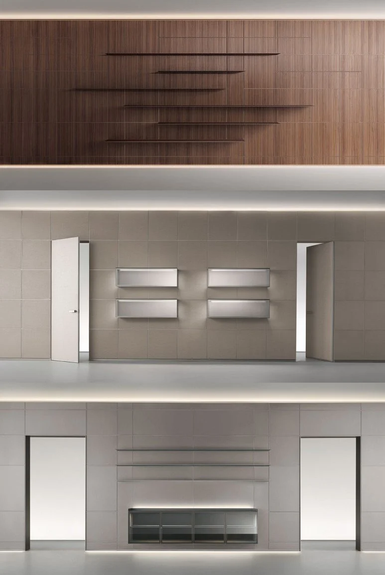 리마데시오가 2022년 밀라노 디자인 위크에서 새롭게 선보인 모듈러 마감입니다. 따스한 무늬목과 수평으로 뻗어나가는 잔잔한 패턴이 특징입니다.