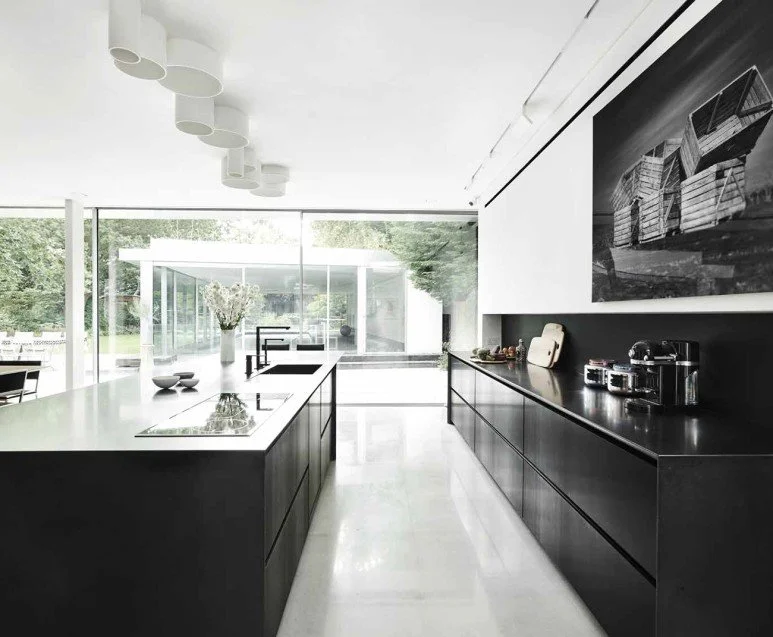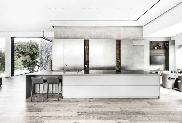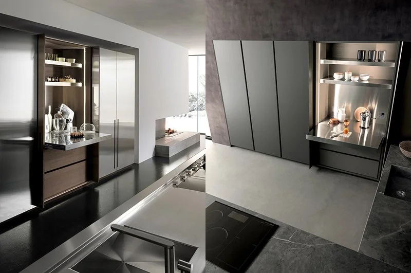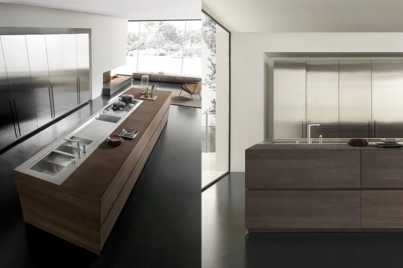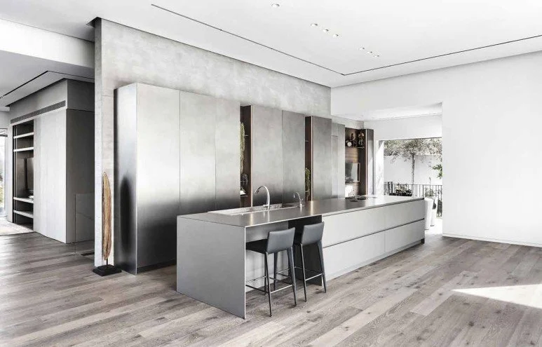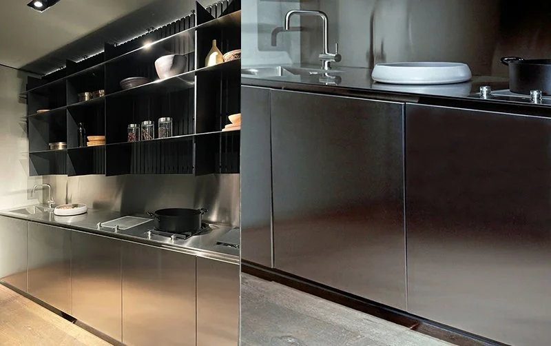 최근에는 스테인레스 스틸(Stainless Steel) 주방이 주목 받으며 주방 가구 전체를 스테인레스(스테인리스) 스틸로 마감하는 사례도 종종 볼 수 있습니다.