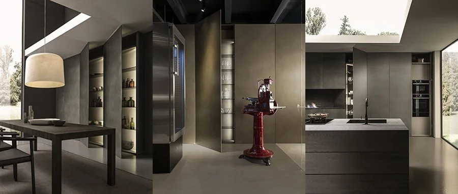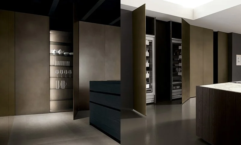모듈노바는 아이론 더스트를 포함하여 다양한 메탈 마감 블레이드 도어를 선보임으로써 메탈릭 컨셉과 무드를 강조합니다.