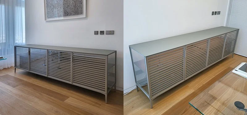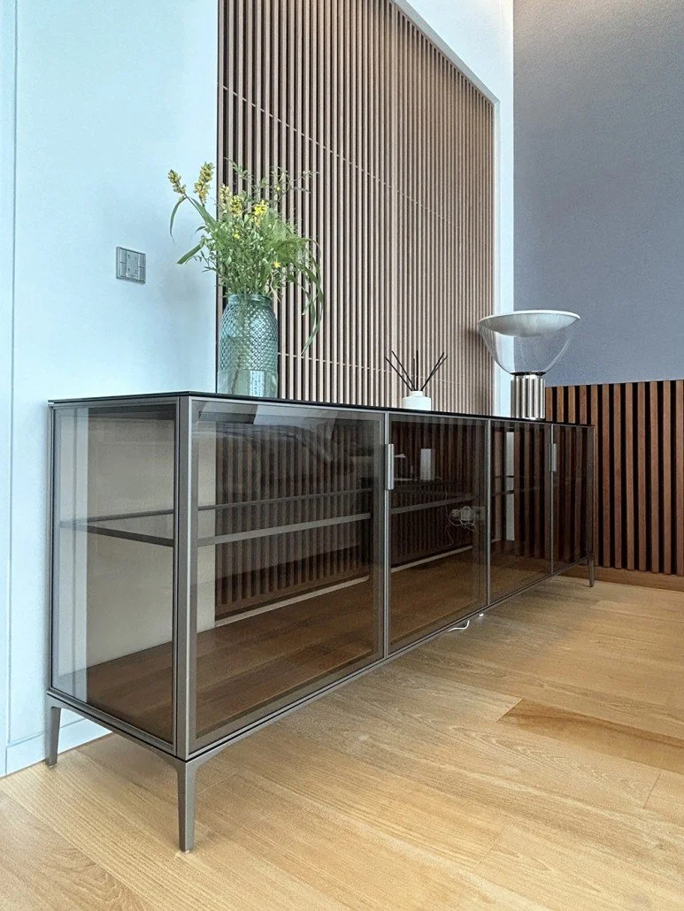 모던하며 도회적인 서재 분위기를 반영해 메탈릭한 컬러의 플라티노(304 Platino metalized) 알루미늄 구조와 은은한 그레이 빛의 리플리뗀테 키아로(67 Riflettente chiaro) 글래스를 매치했습니다.