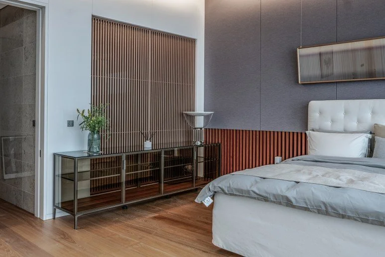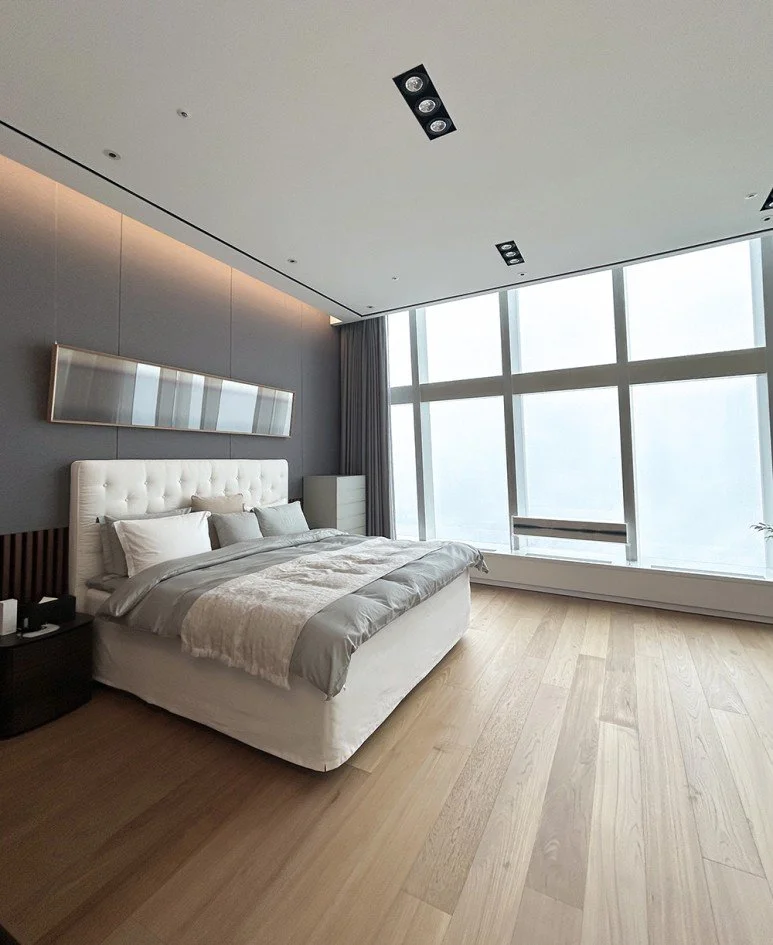 펼쳐진 시티 뷰가 그림이 되는 마스터룸, 거실 만큼이나 핵심이 되는 공간입니다. 모던한 인테리어와 차분한 컬러 팔레트는 거주자가 편안하게 휴식을 취하도록 도와줍니다.