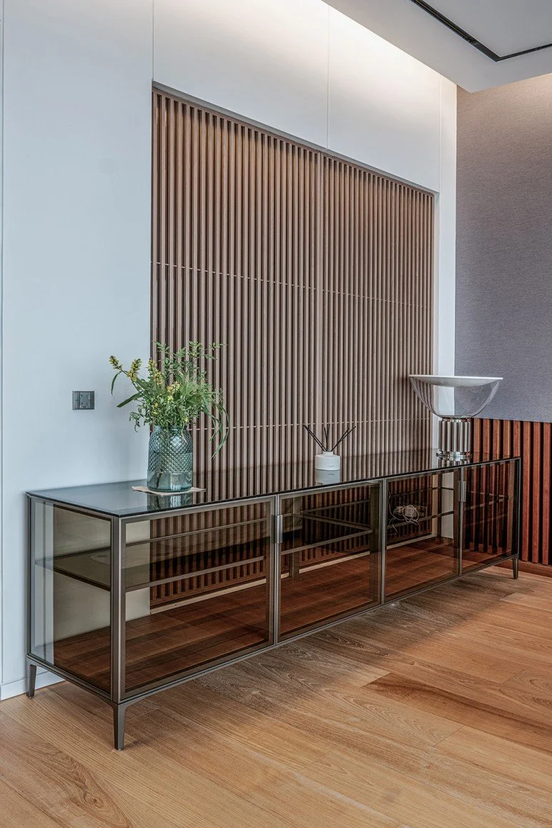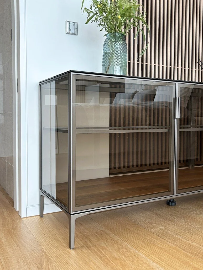 세일과 동일한 마감인 브론즈 컬러(65 Bronzo trasparente) 글래스 바디와 노체 우드(15 Noce) 베이스 선반을 택하여 시선 이동에 따라 미적 통일감이 느껴집니다.