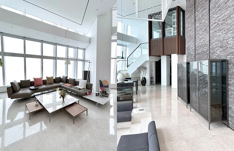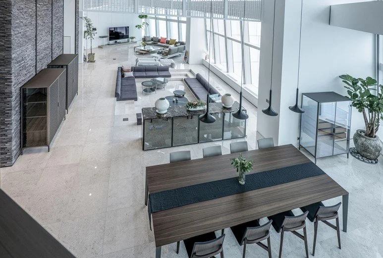 지난 1편에서는 펜트하우스의 심장부인 거실 인테리어를 소개하였는데요. 광활한 스케일과 모던한 인테리어와 잘 어울리는 리마데시오 제품을 자세하게 살펴 보았습니다.