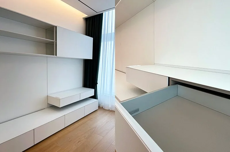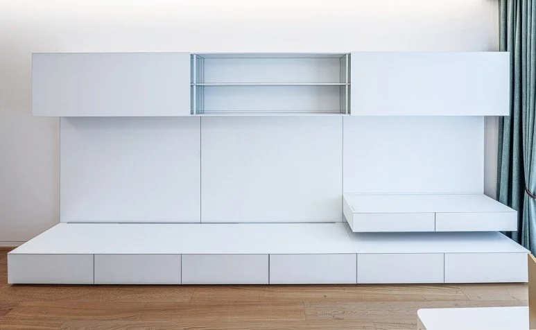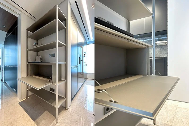 거실에는 또 다른 타입의 셀프 업 캐비닛이 디스플레이되었습니다. 마스터룸과는 다르게 수납 유닛 겸 미니 데스크로 활용이 가능한 모델로 제작되었습니다.