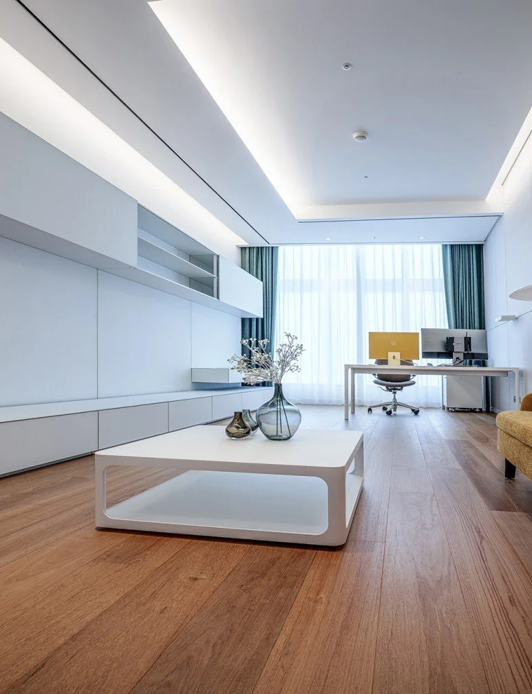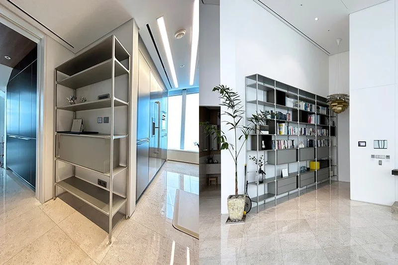 듀플렉스 구조인 복층 서재에도 플랫 시스템이 동일하게 적용되었는데요. ㄱ자 코너 구성을 통해 펜트하우스 전경을 내려다 보며 작업이 가능하도록 꾸며졌습니다.