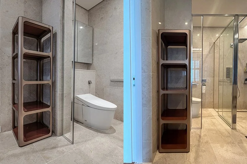 해당 모델은 글래스 소재 특유의 투명한 이미지를 부각하였습니다. 간결한 무드를 이어가기 위해 내부 역시 가벼운 선반 형태의 수납만을 적용했습니다.
