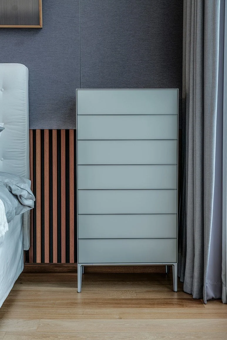 마스터룸 속 또 하나의 수납 가구, 셀프업입니다. 연한 베이지 컬러의 리노(98 Lino) 매트 글래스로 전면을 마감하여 베딩과 부드러운 어울림을 전합니다.